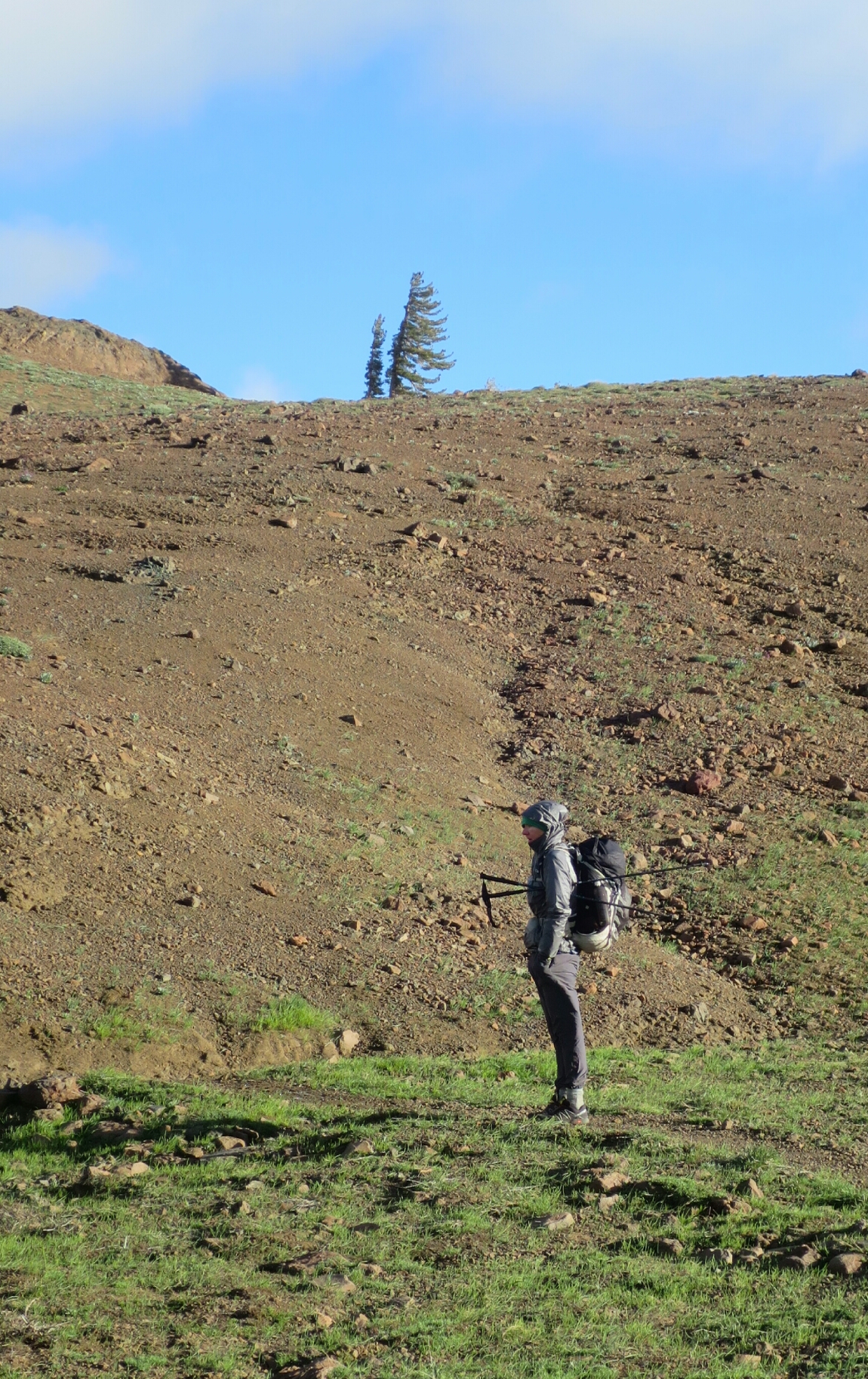 The rolling scour of the wind through the treetops did not let up through the night. The rain has gone and the sun was back. It was so very cold that by the time we broke camp my hands were frozen. We were not in direct wind it was just very, very cold. As we headed off on the trail we could see why, the ground was frozen and as we walked it crunched underfoot. The ground stayed frozen till almost mid-morning.