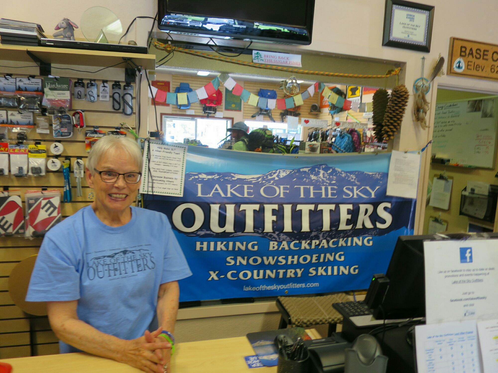 So we checked out after 11 and got the bus back to the Y. It was sunny and warm outside and people were dressed in summery clothes. It is the first time since leaving the desert that I was in shirt sleeves. We dropped in to the Lake of the Sky Outfitters for Hammer to pick up his new pair of Darn Tough socks. His old pair got a hole and they were replaced under the Darn Tough lifetime warranty. We spent a while in the store chatting to the lovely lady working there.