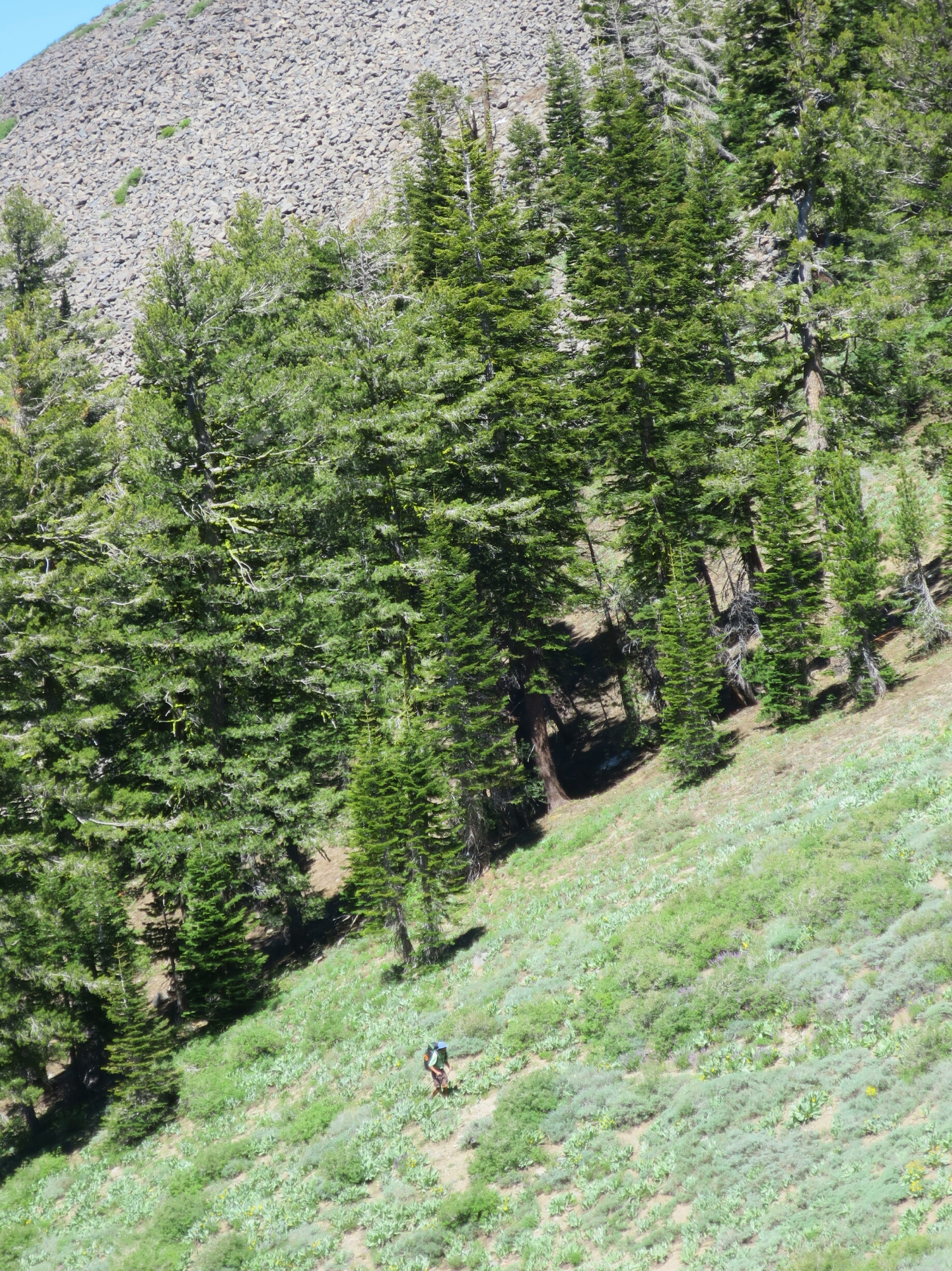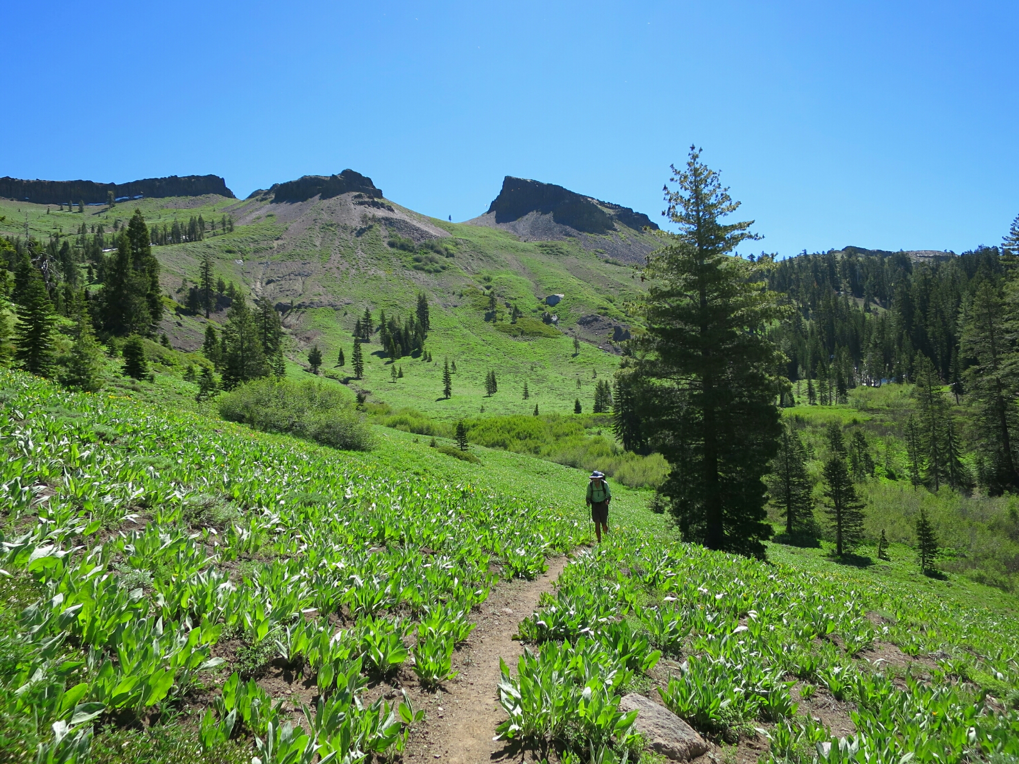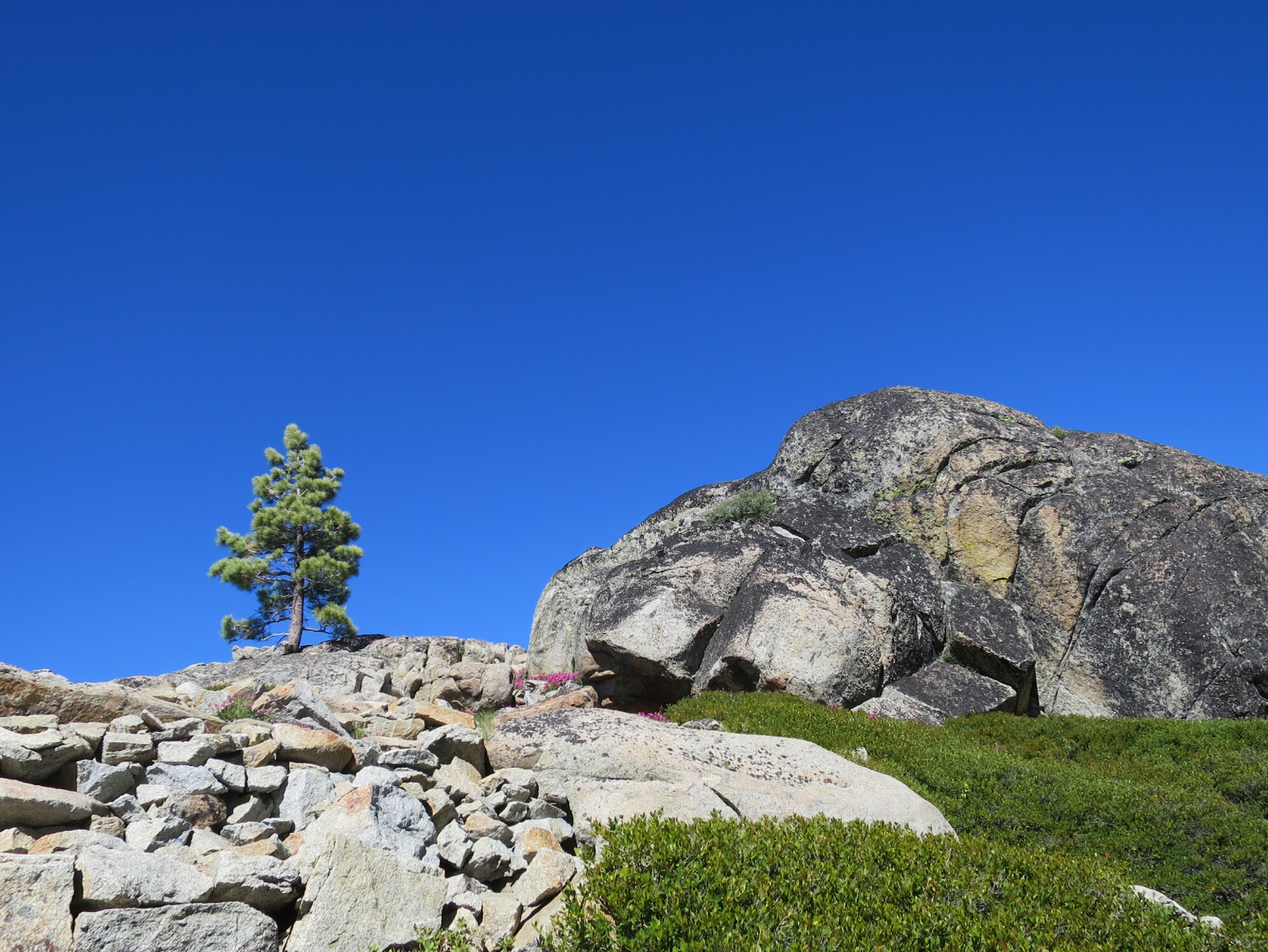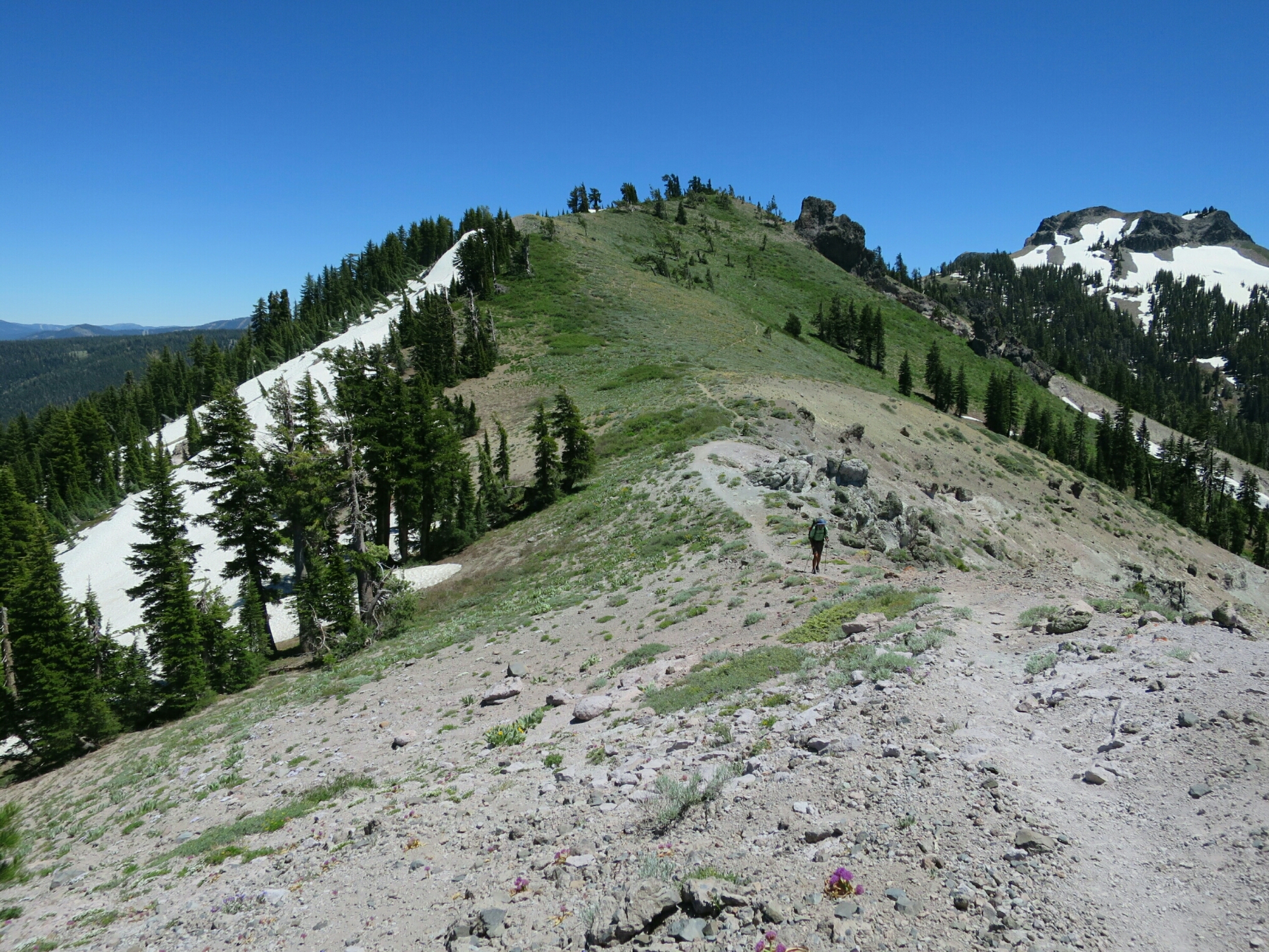 Hiking along the summit from Tinker Knob was quite special. We had terrific views of Truckee and surrounds to the east and dense green valleys with eroded mountain peaks to the west. We are continually impressed by the amazing trail work on the PCT. We often stop and wonder how the trail builders managed to construct and then maintain some sections. This section looked particularly difficult.