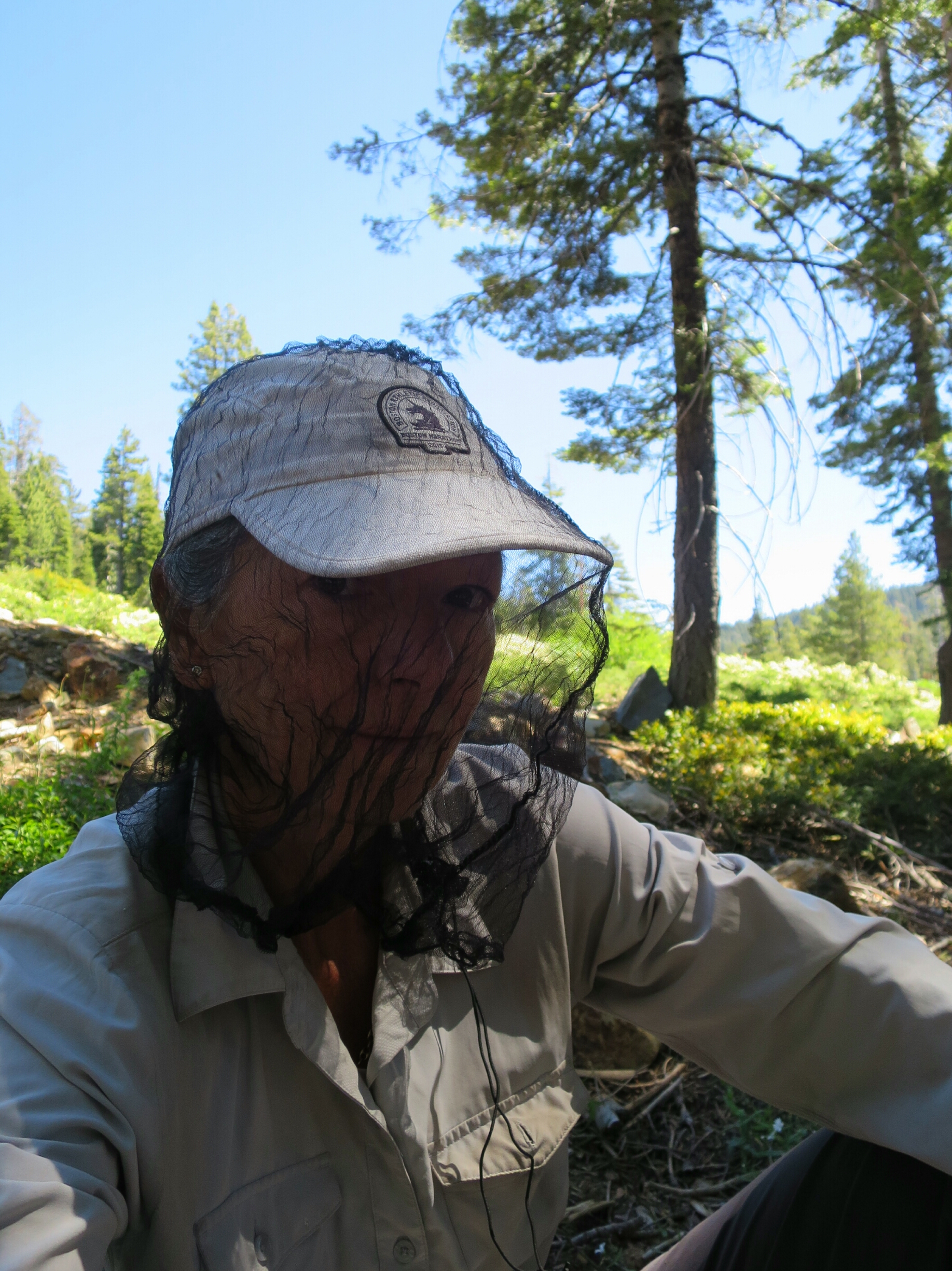 By lunchtime we realised that we were running out of water. We made a slight detour off the trail to a creek, down where the trail crosses Quincy – LaPorte Road, to filter water and have lunch. The gnats and mosquitos were ferocious which made for an uncomfortable time. We rushed to finish eating so we could escape. Not exactly a relaxing reward for a morning of hiking. Rejoining the trailhead we met up with Red Cross who was standing by a pickup truck talking to the driver. He welcomed us an offered us a beer (Bud Light) which we welcomed on such a hot day. The pickup drove off and we hiked on for a few miles with Red Cross where she stopped for lunch.
