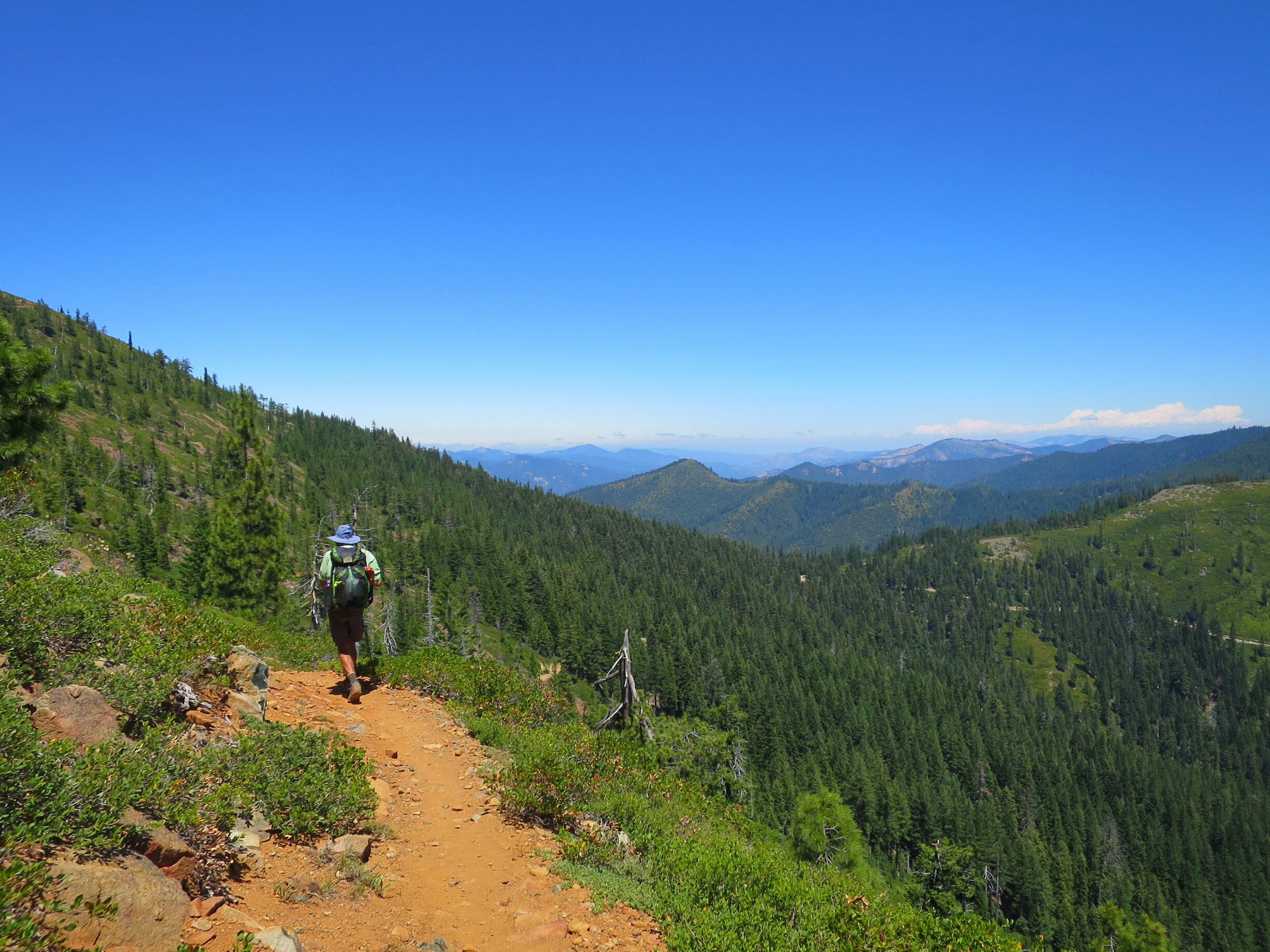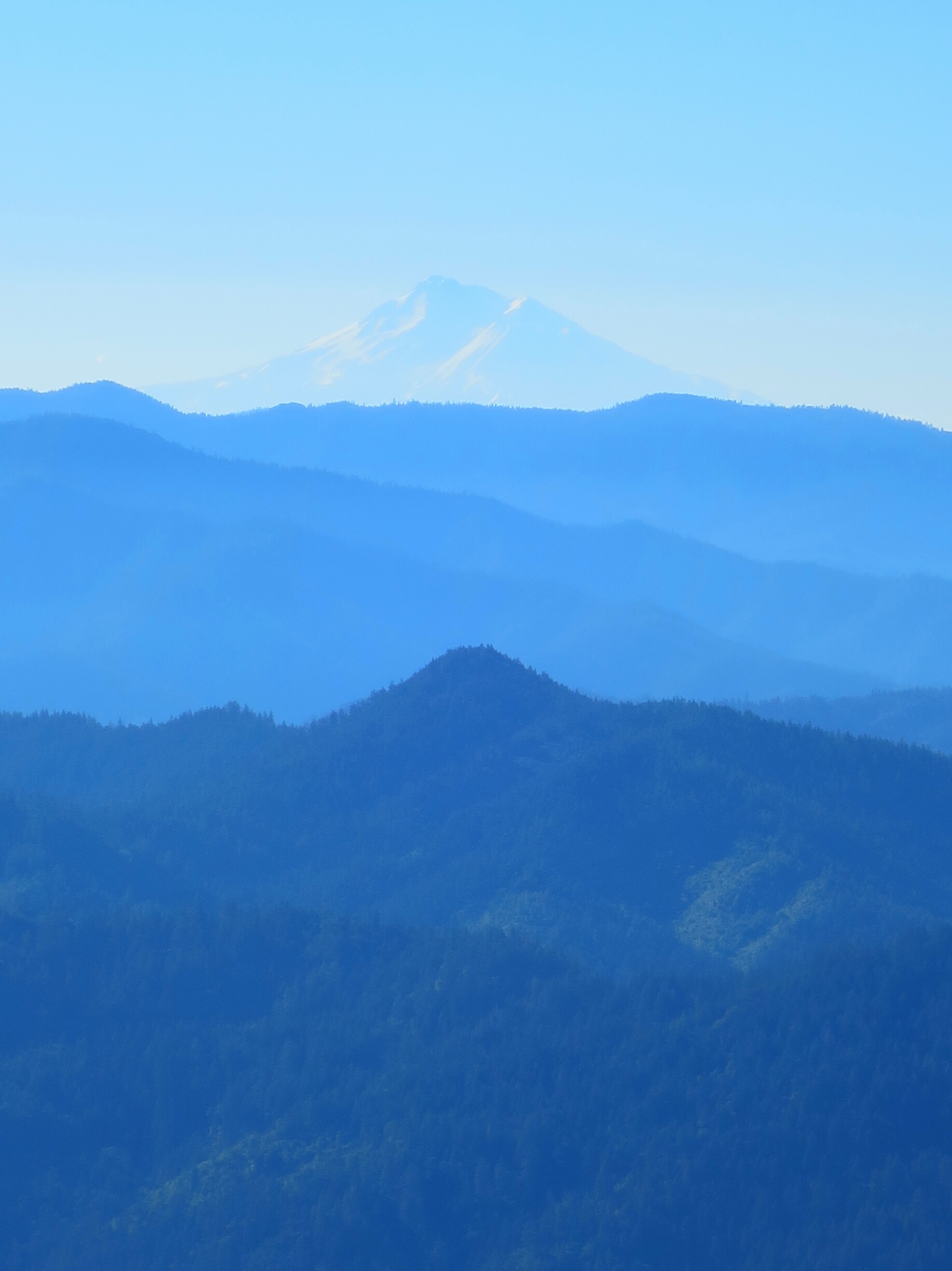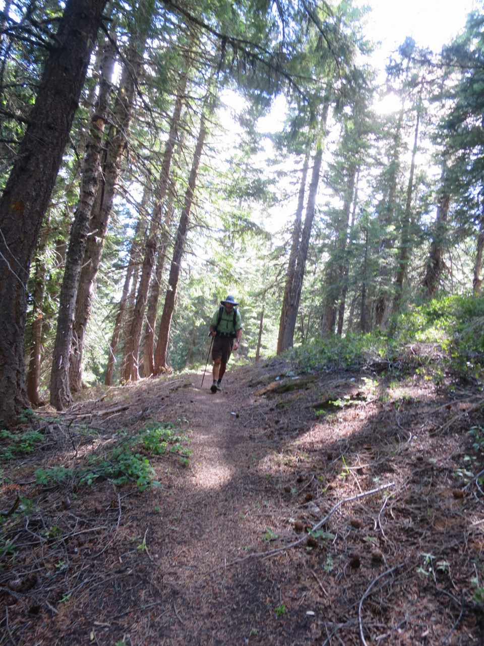 So it was good that we got out last night and made a start on the climb. Because this morning the trail just went up and up for another 7 miles. The morning was cool and we were shaded which helped. It was exhilarating to reach the top of the climb and look back down on the Klamath River winding its was through the valley. And Mt Shasta popped into view above the chain of deep green mountains. Such a beautiful sight, almost worth the climb. Even though we were way high above the valley we could hear the loud speaker at the markets which were on in town this morning.