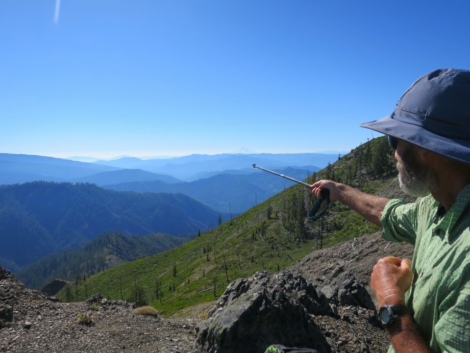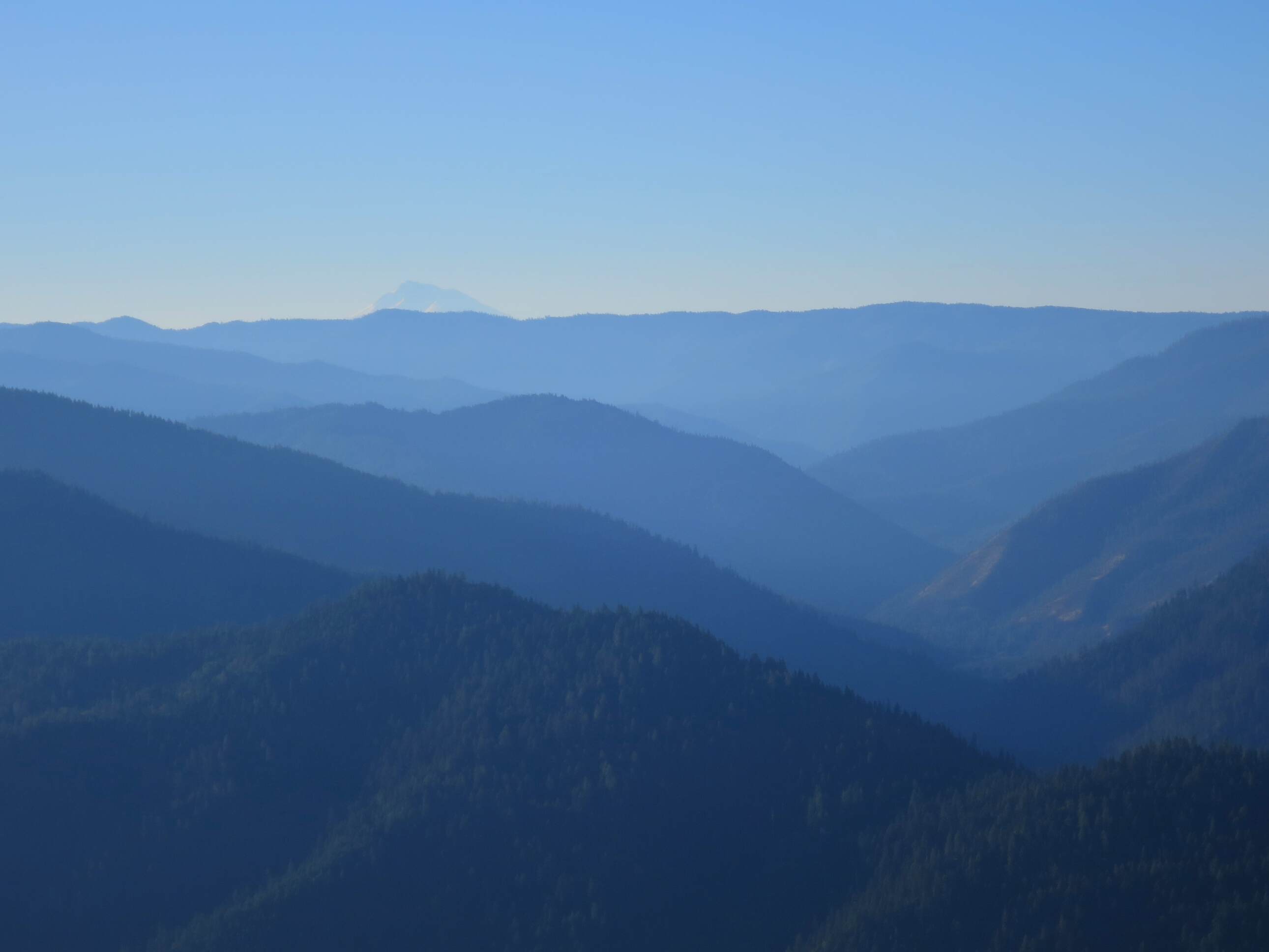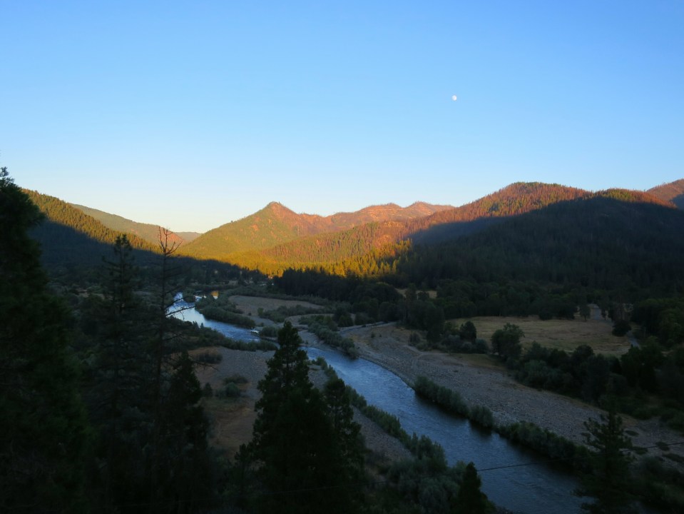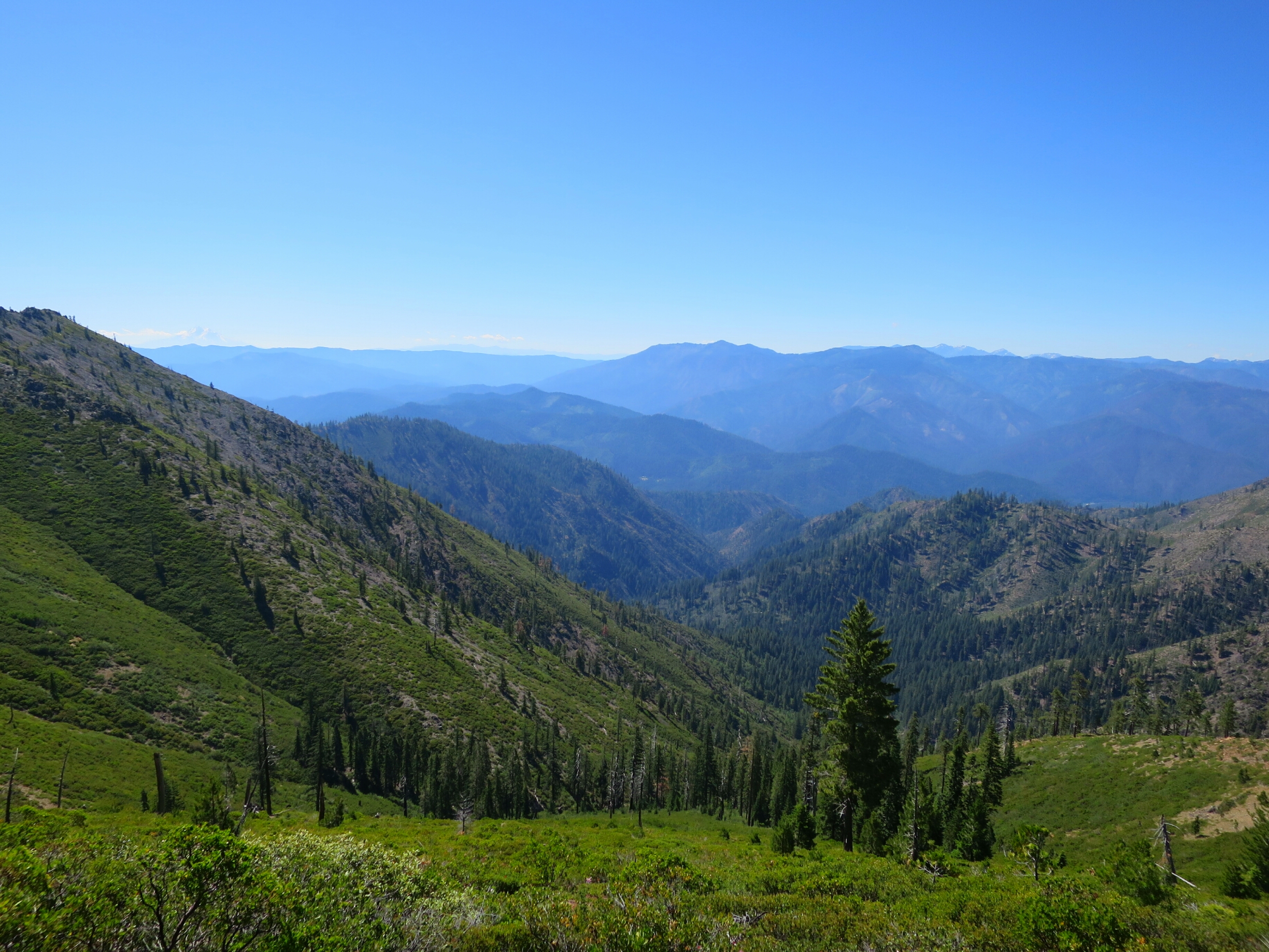So it was good that we got out last night and made a start on the climb. Because this morning the trail just went up and up for another 7 miles. The morning was cool and we were shaded which helped. It was exhilarating to reach the top of the climb and look back down on the Klamath River winding its was through the valley. And Mt Shasta popped into view above the chain of deep green mountains. Such a beautiful sight, almost worth the climb. Even though we were way high above the valley we could hear the loud speaker at the markets which were on in town this morning.