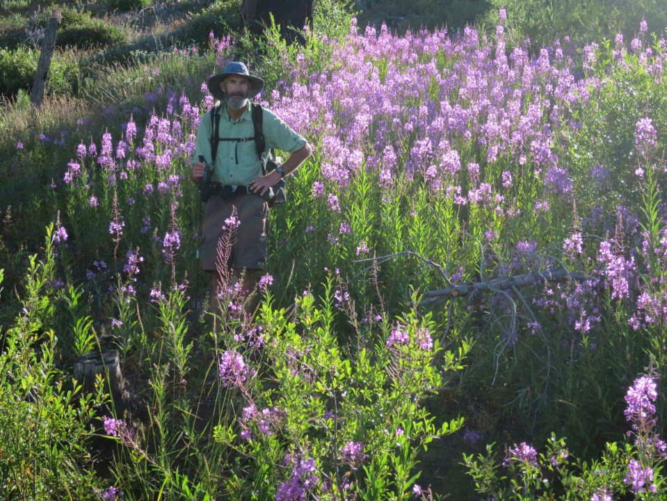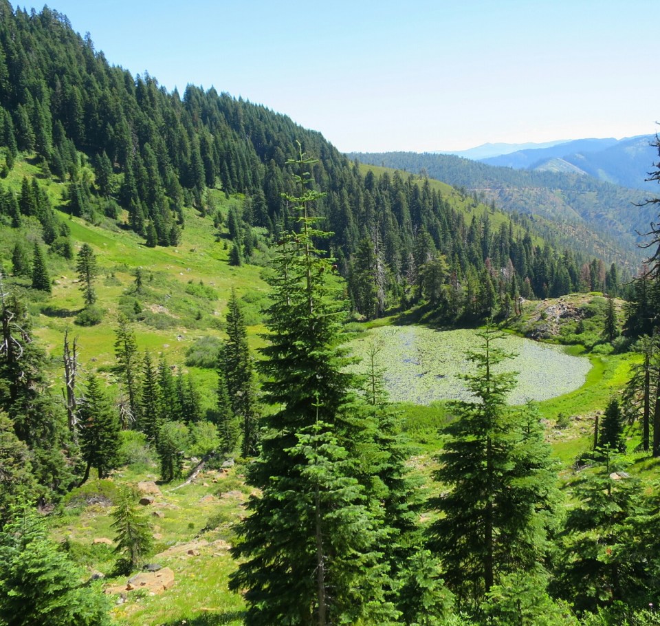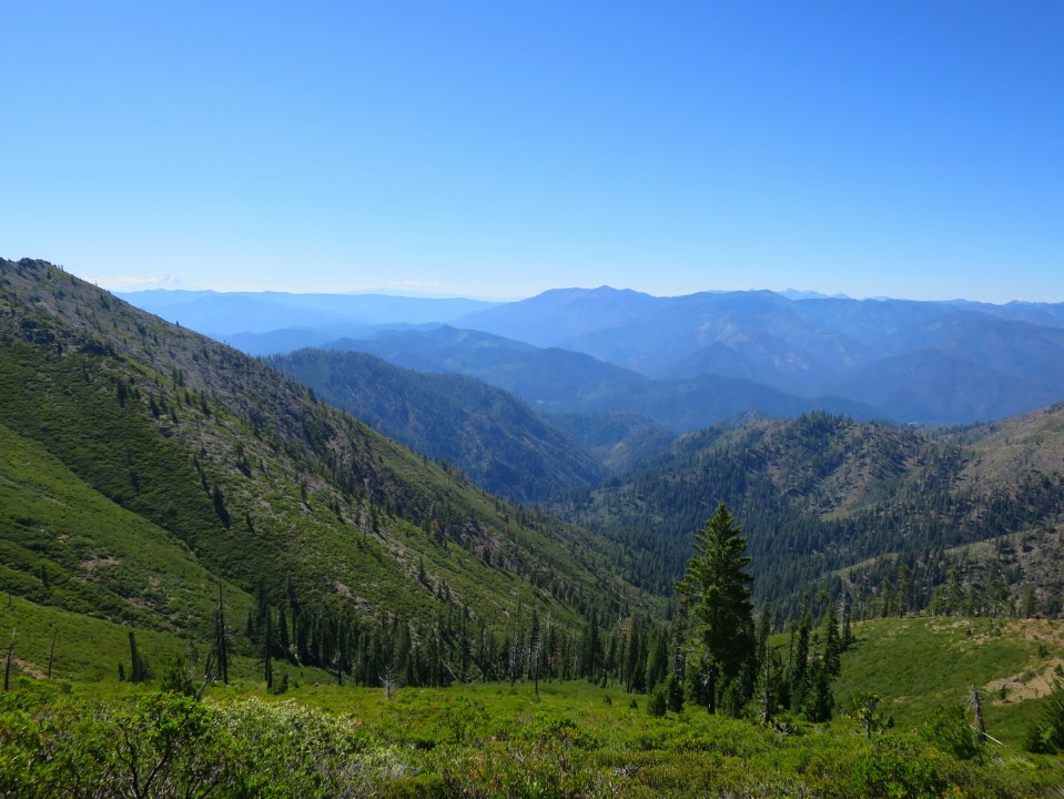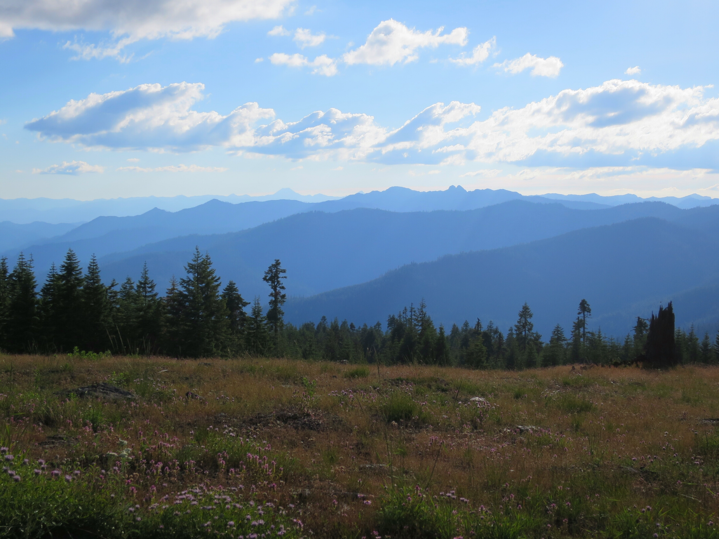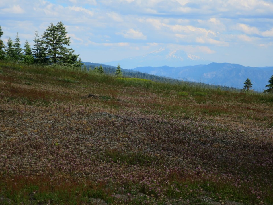 For the rest of the day the trail undulated between 5,000 – 6,000 feet in elevation. It was a brilliant afternoon of hiking with distant views of mountains, a tapestry of flower filled meadows interspersed by cool shade of the forest. Couldn’t ask for more. The meadows looked like Persian rugs had been spread out over these huge expanses of open space.