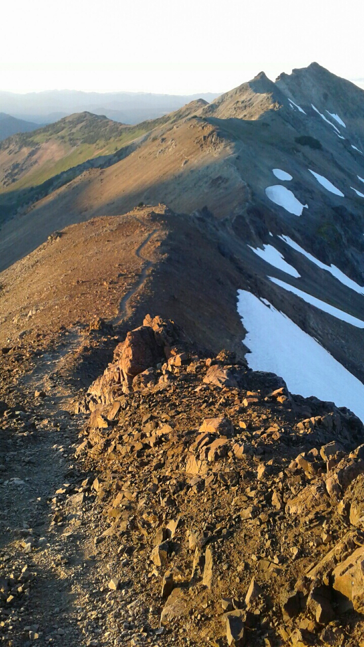 The trail went up to the Old Snowy Alternate which surprisingly had little snow on it. It is a loop which adds about 0.2 miles to the PCT but is quite spectacular as you are basically ridge walking a knife edge of a trail and so is quite challenging. Someone heading South mentioned that a hiker who took the regular PCT route slipped on a steep snowbank and and slid down the slope about 50 yard resulting in significant injuries.