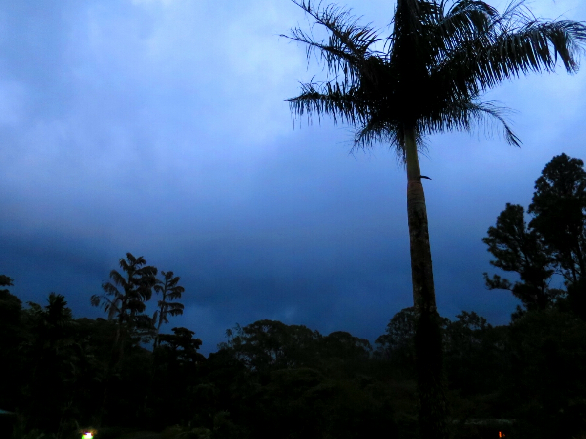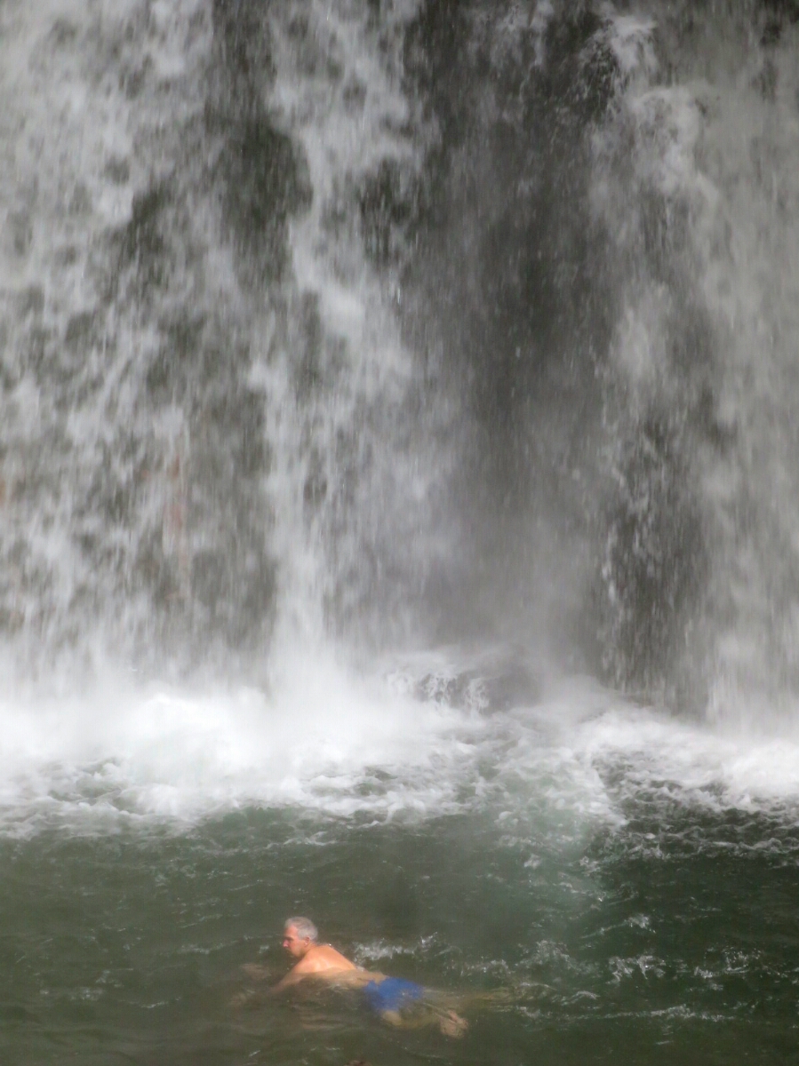 The drive to the Park to the start of the hike took nearly an hour from town. We walked through the rainforest to a waterfall where Hammer had a swim. From the waterfall we walked to a hot spring. A reminder that volcanic activity is still simmering underneath. By mid afternoon the sound of distant thunder and darkening clouds announced that a thunderstorm was rolling in. And we left it too late in the afternoon to hike up to the Cero Chato, a dormant volcano with a lake at the top. The rain did arrive before too long and we took shelter at Arenal Observatory. I have forgotten how dramatic and passionate a tropical rainstorm can be. Within a very short space of time water was running across the road like a river. Soaked to the skin we got back to our hotel. But being so warm it did not matter.