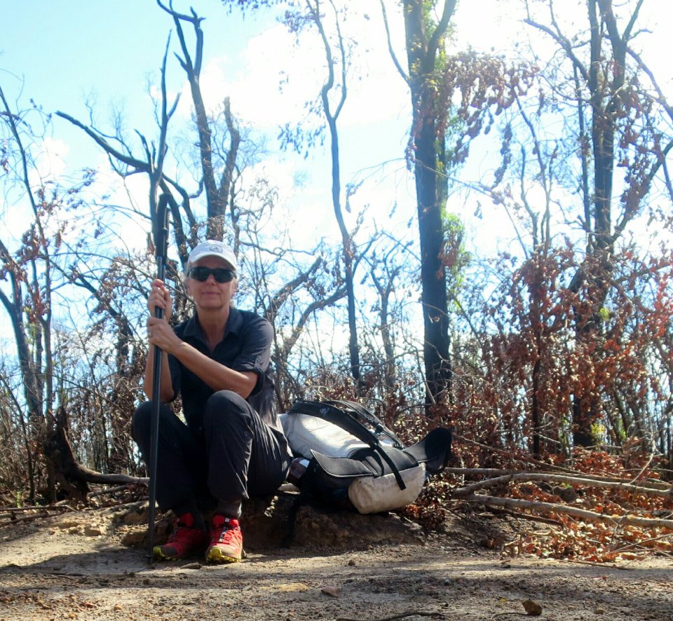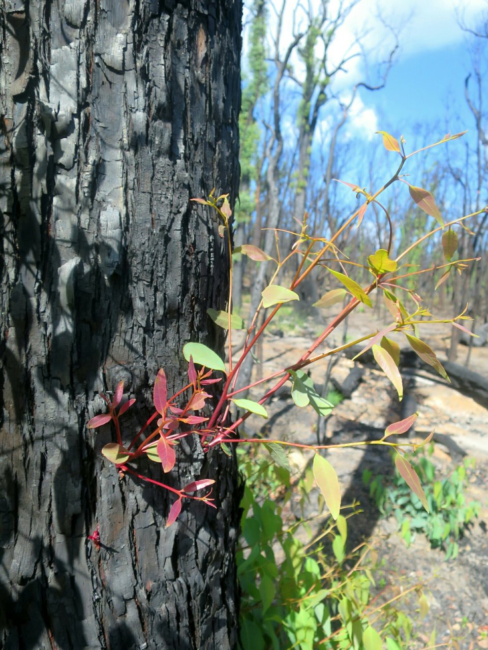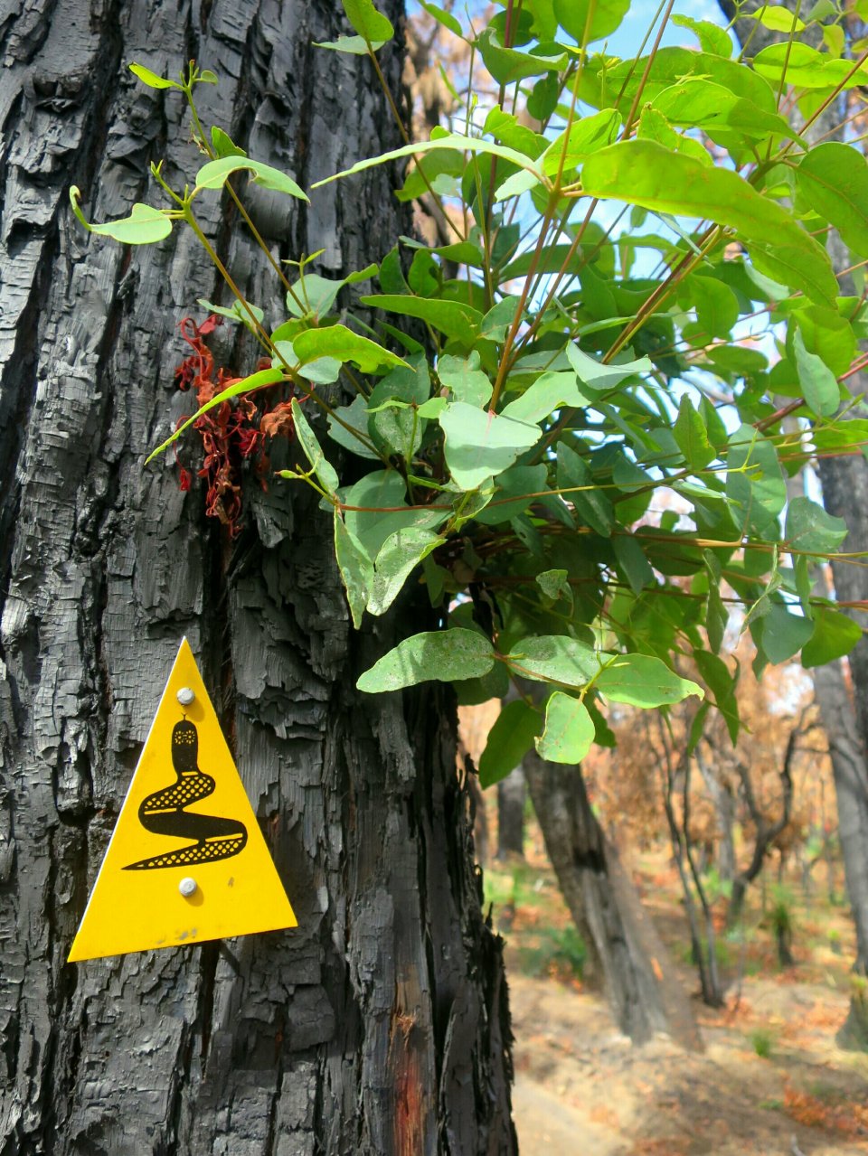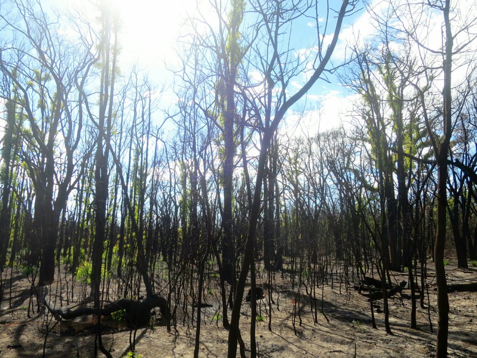 Soon after leaving the dam the trail enters a long burn section. It never ceases to amaze me to see the resilience of the Australian mainland flora to fire. There is so much regrowth, the colour of which looks quite spectacular contrasted against the burnt bark. The sun was out in full force and the temperature was rising along with the trail. I needed a break so stopped for lunch 3km short of Waalegh Shelter. The wonder of the regenerating trees was loosing its appeal.