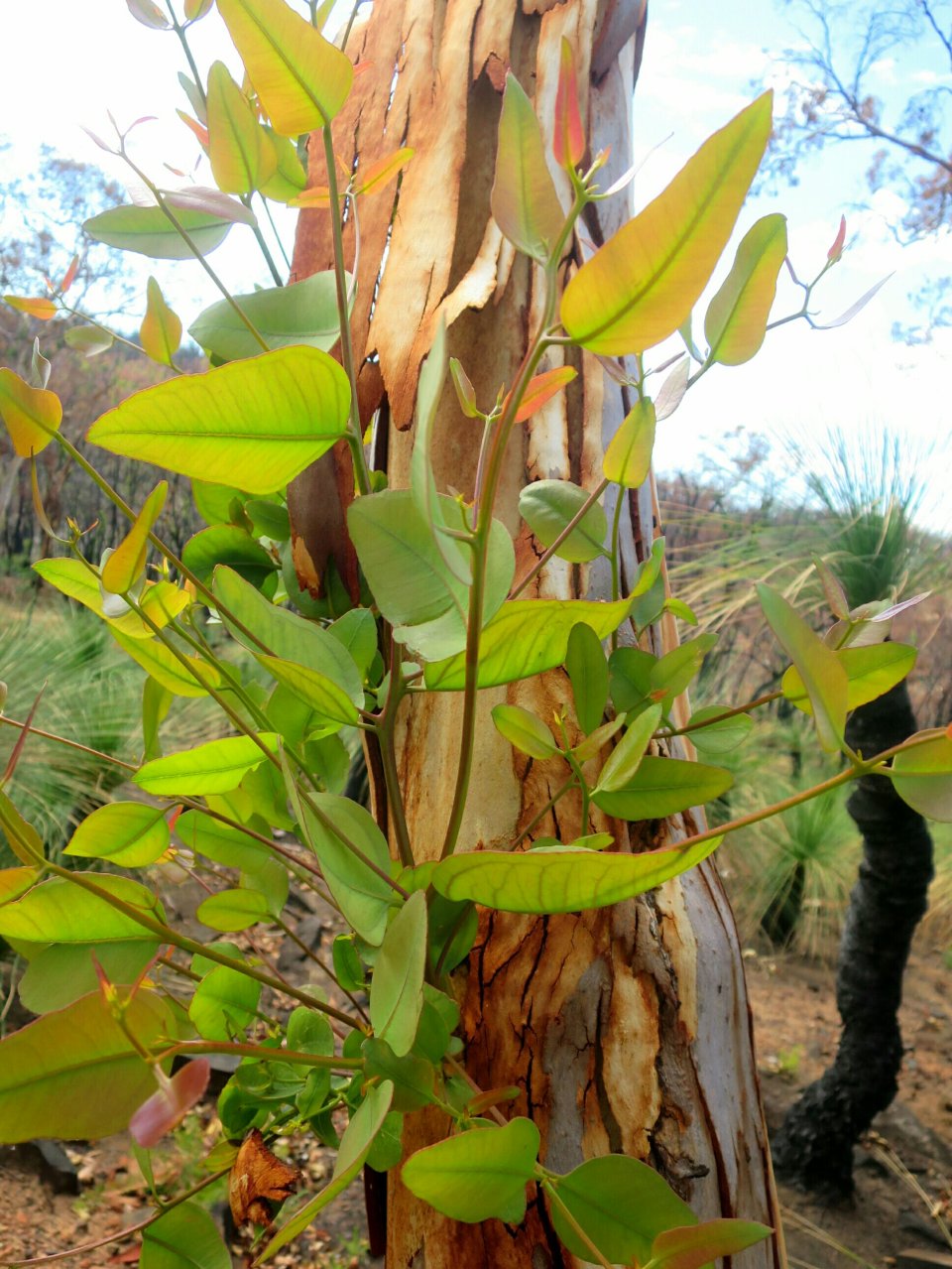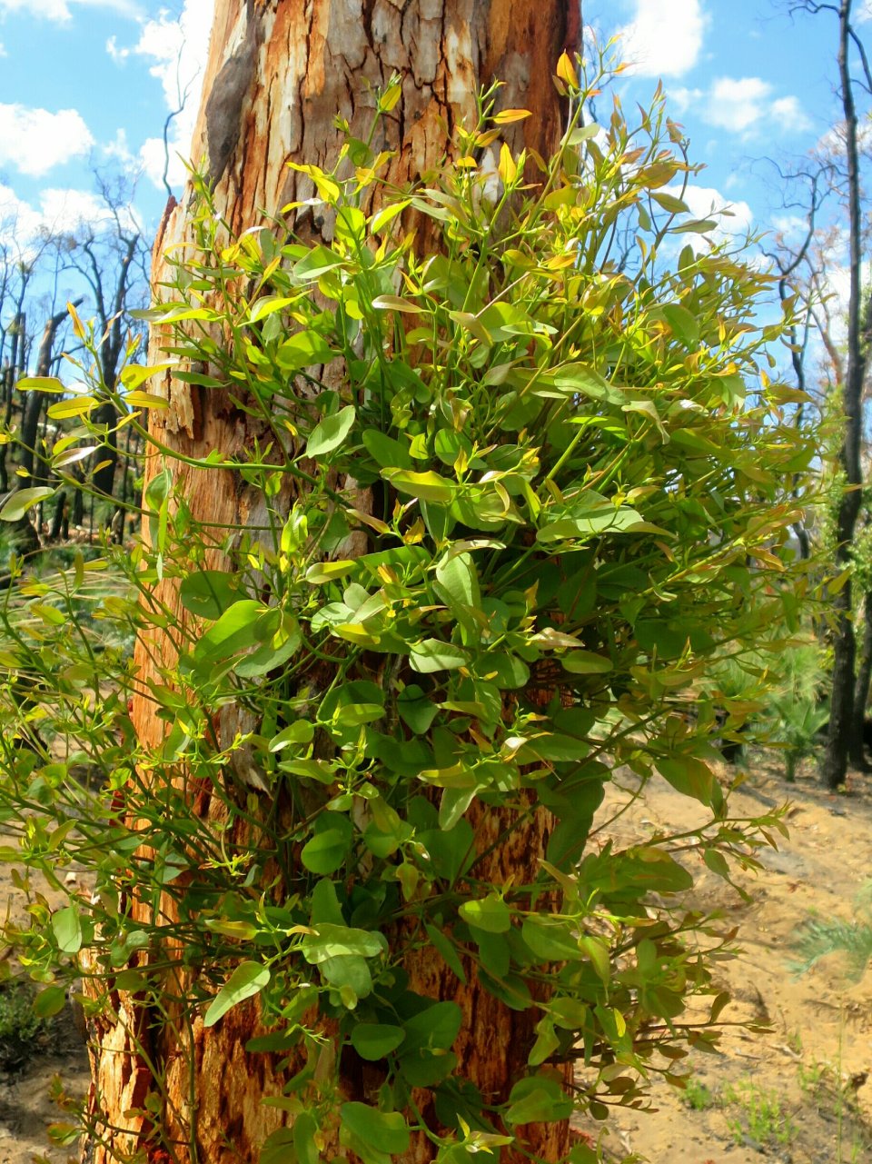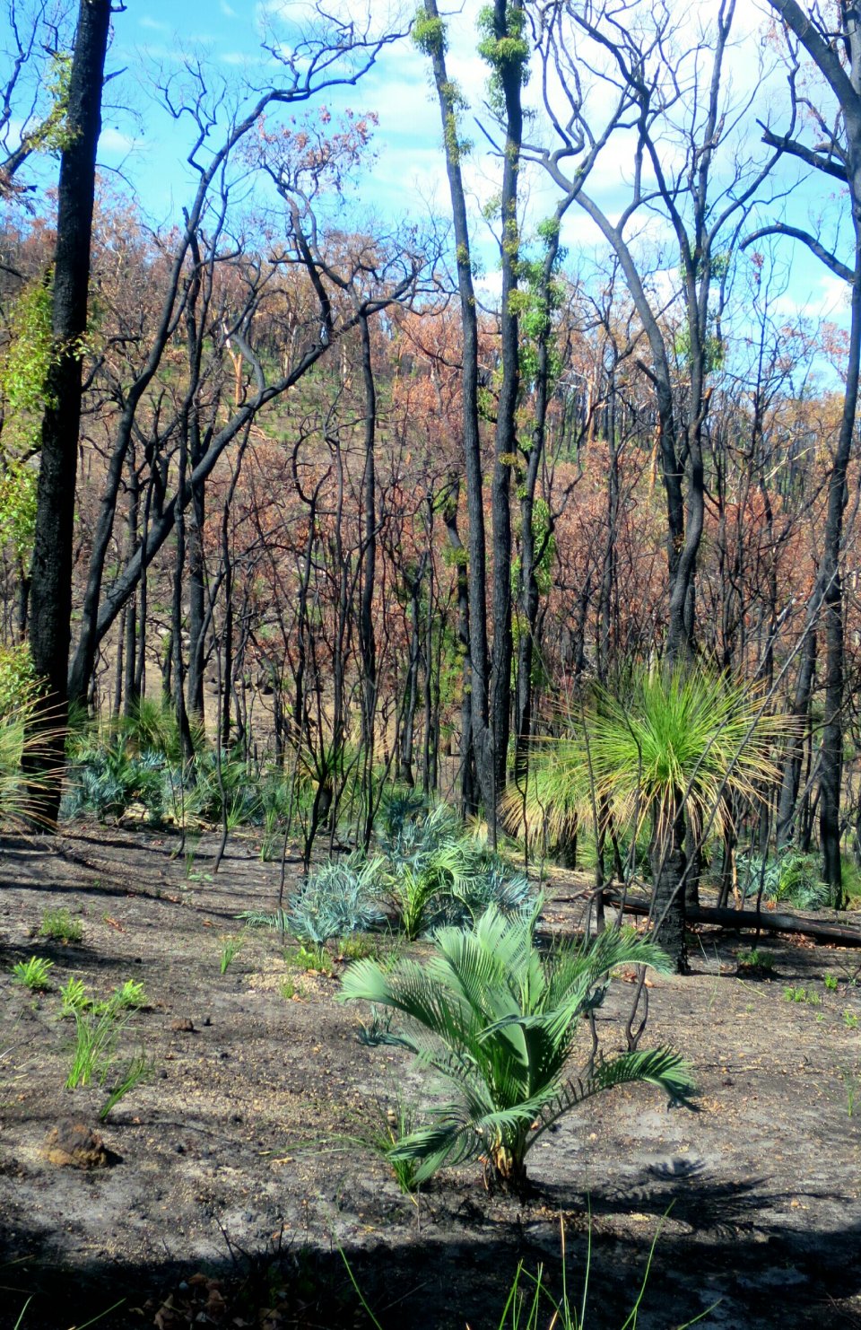 Soon after leaving the dam the trail enters a long burn section. It never ceases to amaze me to see the resilience of the Australian mainland flora to fire. There is so much regrowth, the colour of which looks quite spectacular contrasted against the burnt bark. The sun was out in full force and the temperature was rising along with the trail. I needed a break so stopped for lunch 3km short of Waalegh Shelter. The wonder of the regenerating trees was loosing its appeal.