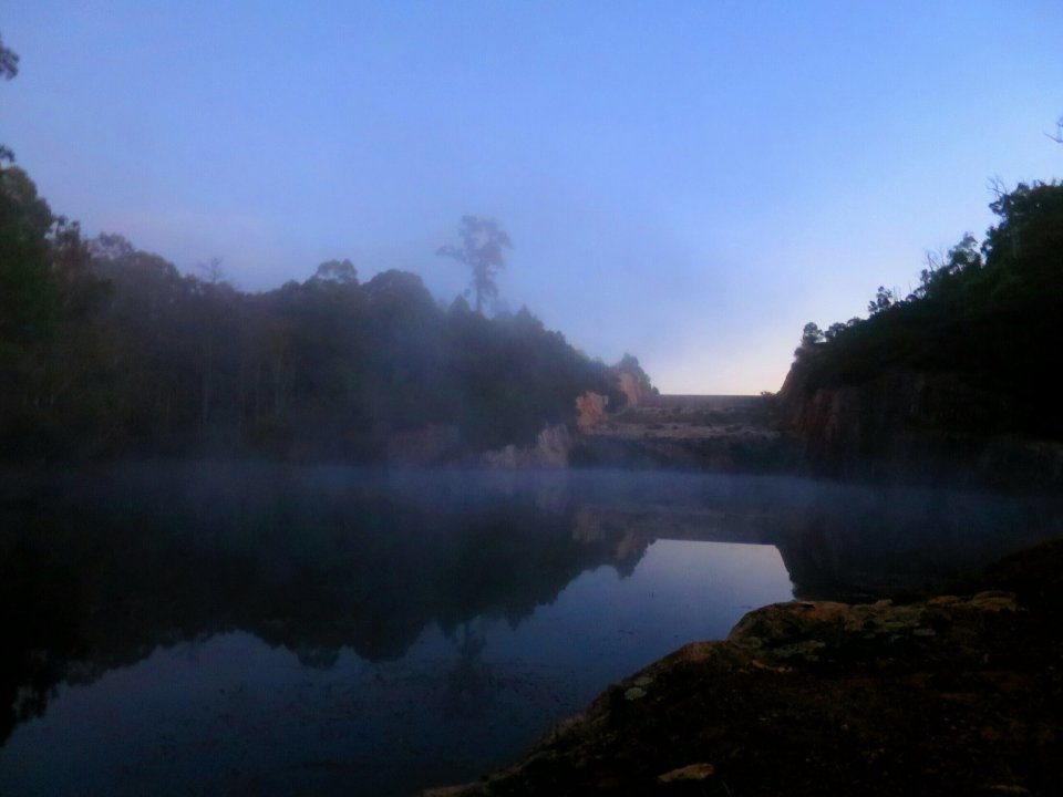 One of the occupants of the shelter was returning from the toilet as I walked by. I apologised for any disruption while I refilled my water bottles.  Being so close to a big body of water it was very cold as I left camp. By the time I got to the dam it was just getting light. The trail passes over one of the overflow channels to the dam. It was a beautiful and eary feeling watching the early morning light dance over the water.