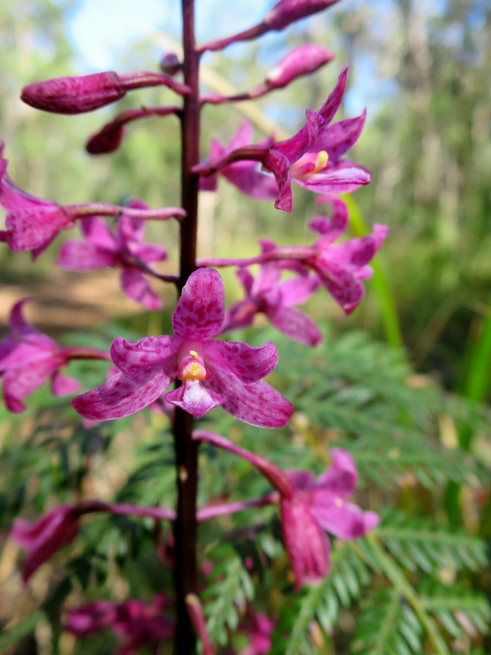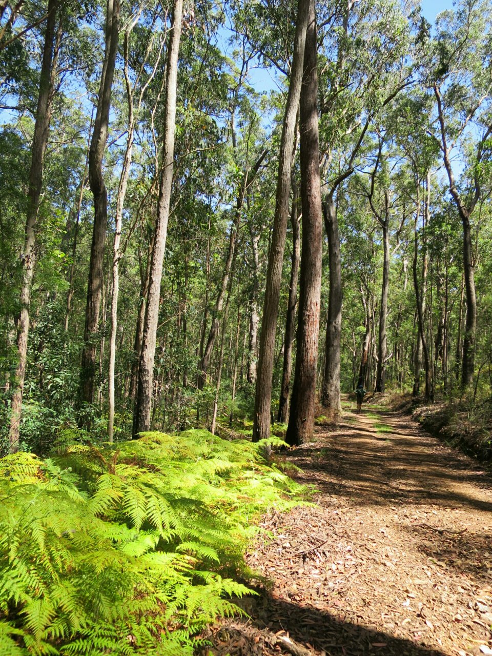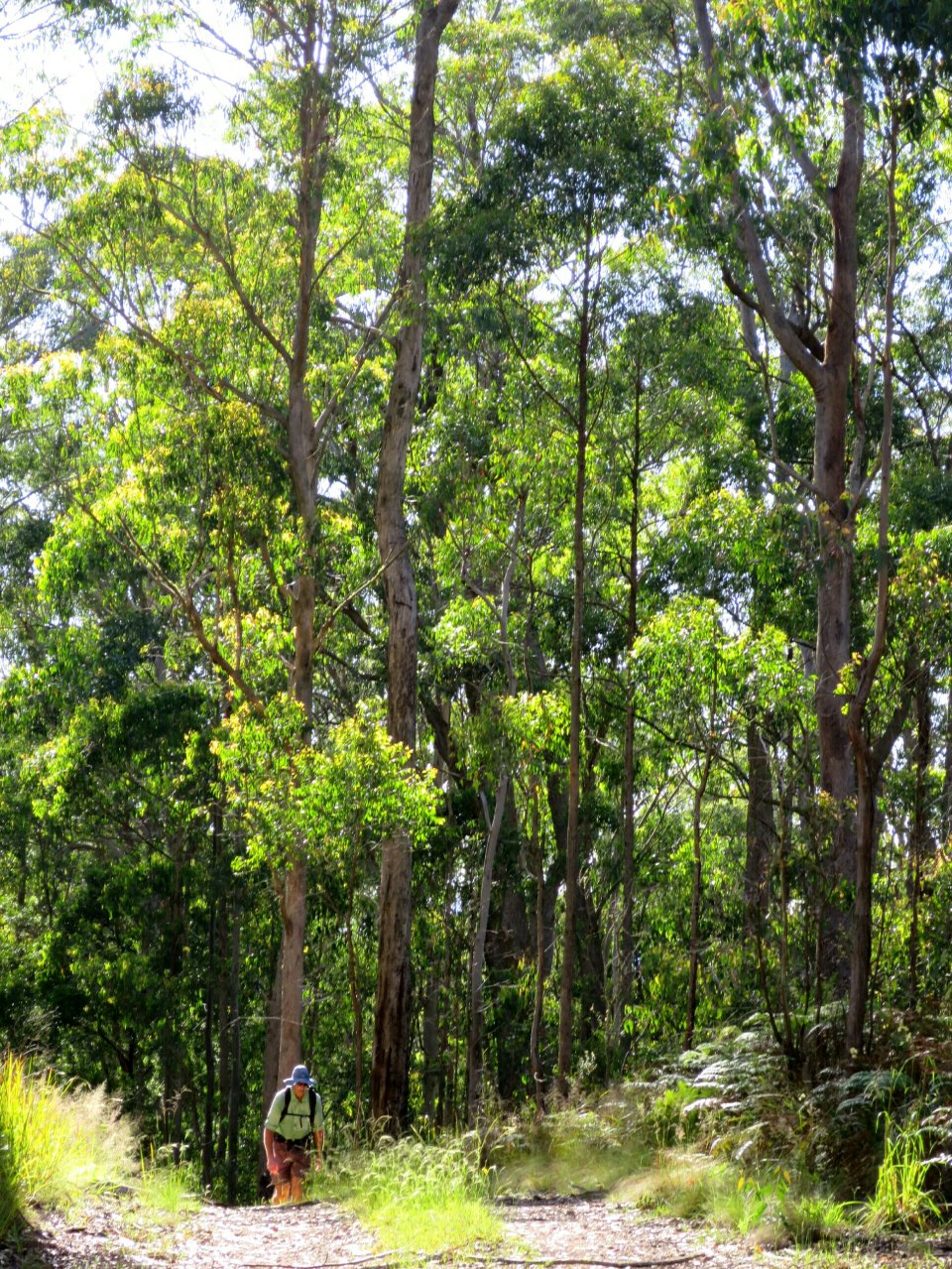 Despite the huge downpour last night, the morning dawned to brilliant blue skies. We were keen to start early to avoid the heat of the day. It was a beautiful start, leaving the clearing and the grazing kangaroos, as the sunrise lit up the surrounds. All of todays walk was along open fire trail with towering eucalypt trees providing shelter from the sun. Flowering wattle trees gave off a faint scent as we passed. The understory was lush and green and in large areas dominated by bracken fern. A few understory plant species were in flower which provided a nice contrast.