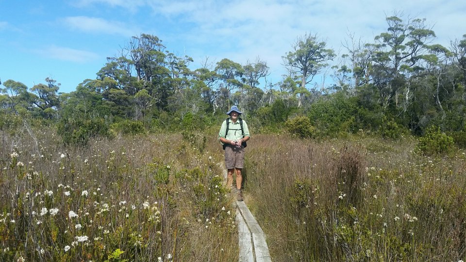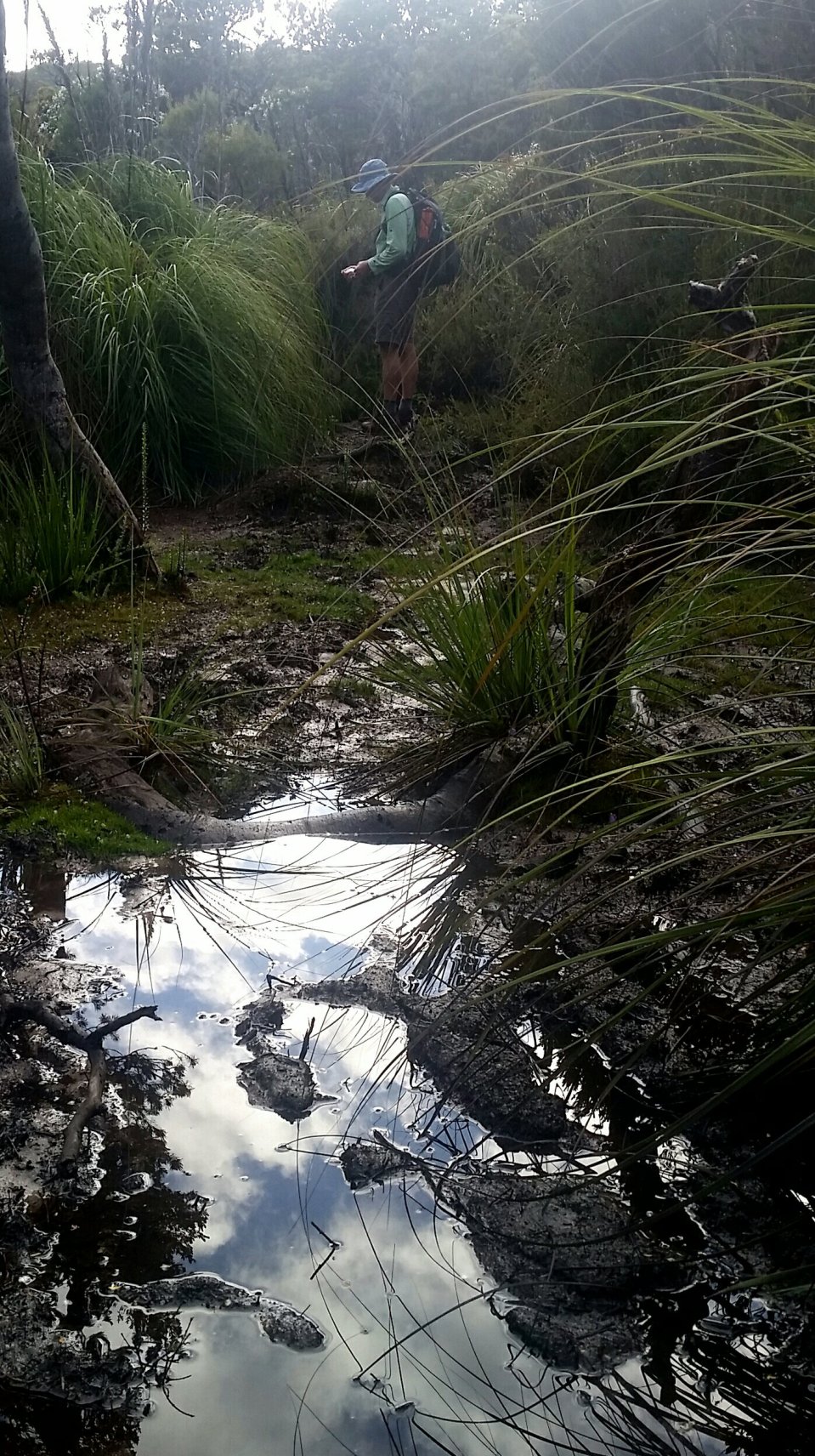 You come out of the wet dark and muddy forest into button grass fields and boardwalks, open air and clearing skies and sunshine. Hammer was brought to a stop at this point by a large tiger snake lying by the side of the boardwalk section. It was coiled and sunning itself. It was just where you would expect to see a snake. Lucky this one was not aggresive and slithered away. Despite feeling like we were moving faster we ended up covering this first section in almost the same time as on the outgoing leg …it just felt easier.