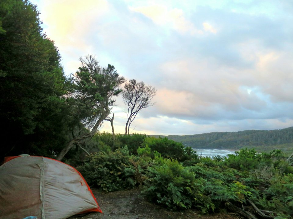 The wind subsided through the night and some rain must have fallen as the tent was wet when we woke this morning. It was still dark and I lay in my sleeping bag listening to the incessant pounding of the ocean. It was a background roar and it sounded angry. I realised that I much prefer the silence of the forest and the sound of slow awakening of the birds at twilight.