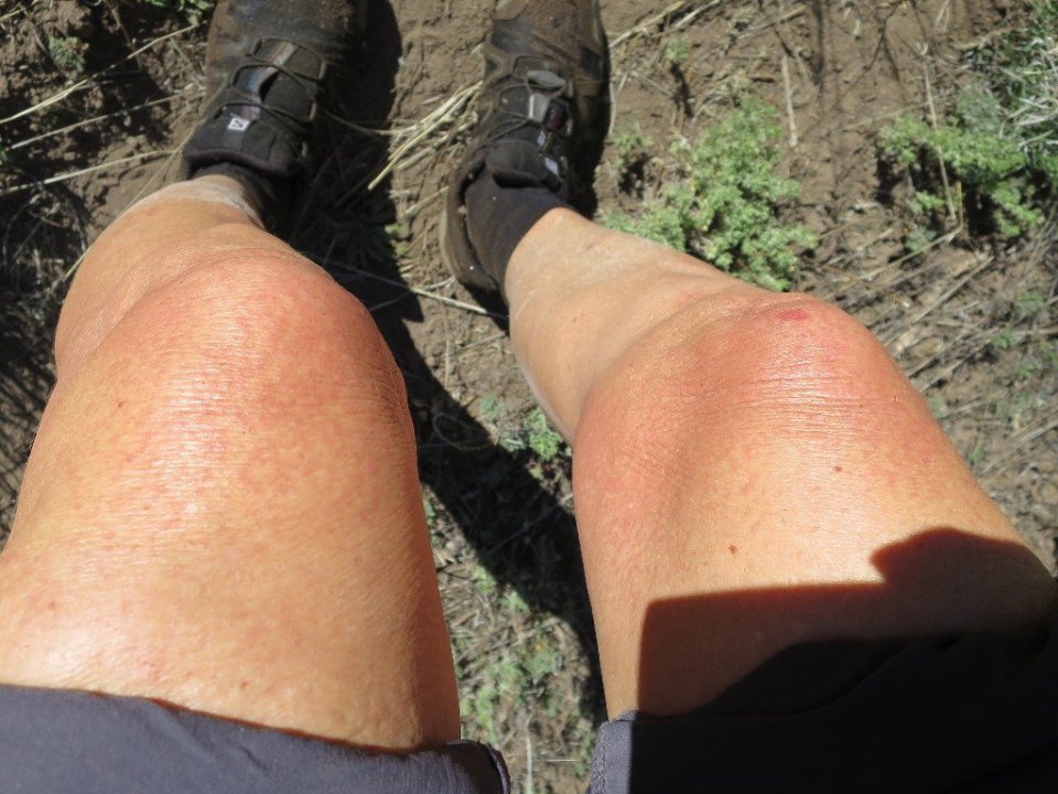 We still had about 5 miles to our destination Snow Lake which is the headwaters of the Middle Fork Gila River. We stopped for a short break and I noticed a burning sensation around my knees. Hammer said he felt the same and thought it may be sunburn. I thought it may be scratches from the rose bushes which lined parts of the trail today. We walked on a bit and the irritation became an unbearable burning. I looked at the skin and noticed a red rash had developed.