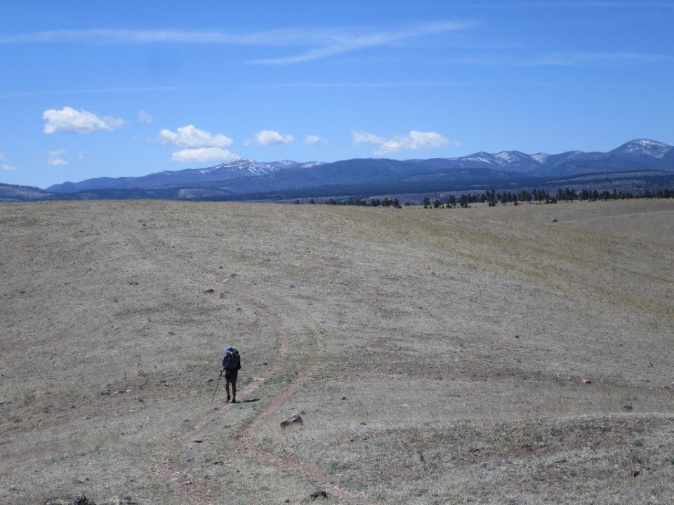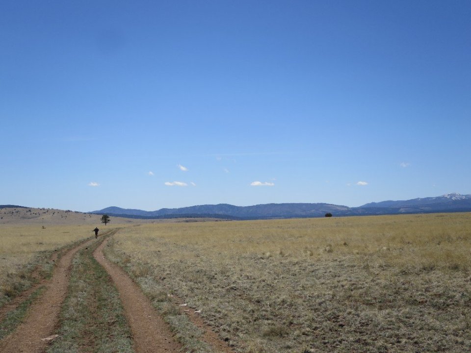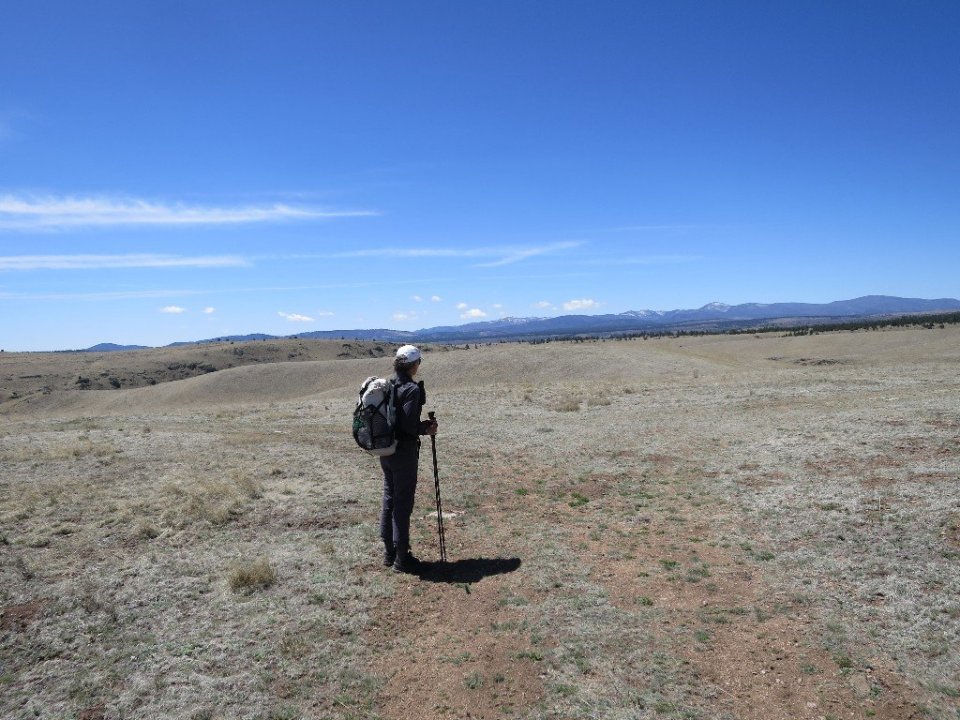 Leaving the river for the last time we climbed out of the catchment and hiked for a couple of miles along an exposed grassy plateau. We were at 8000 feet in elevation and it was shimmering grassland as far I could see. An occasional small tree punctuated this landscape. Snow covered mountains of the Mogollon Range were in the distance behind us. This probably explains why the wind felt so cold. It seemed such an incredible contrast to the river canyons we’ve just exited.