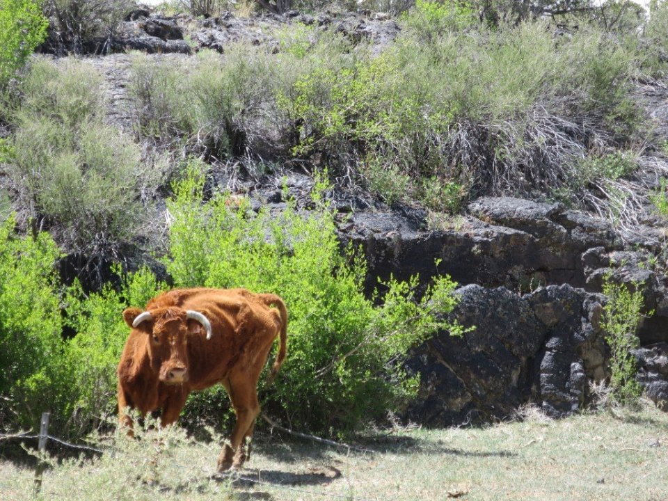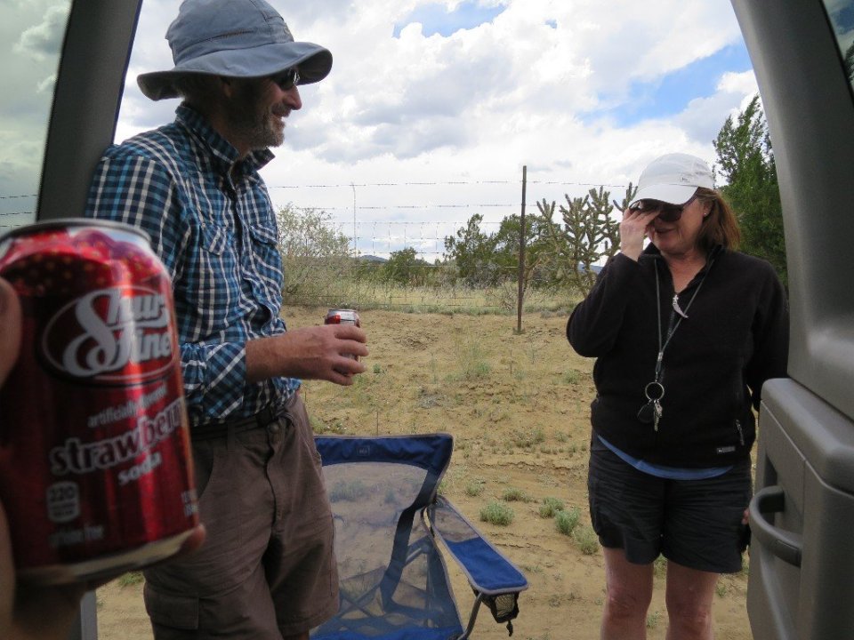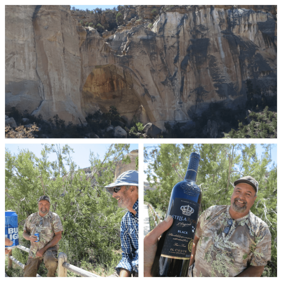 Leaving The Narrows the road started to descend. The sandstone cliffs continued on as did the lava field. Just before the road leveled off we passed a huge sandstone wall which was eroded though the middle creating an arch. We stopped to have a look at La Ventana and we had our third bit of trail magic. Here we met Charlie, who said he saw us walking on the gravel road yesterday when he drove through in his caravan. Charlie is New Mexican born and bred and is now retired and runs hunting trips. He offered us a beer which was very welcomed being so close to lunchtime. We chatted for a while and just before he left he gave us a gift, a bottle of red wine. How could we refuse such generosity. And as we are heading to Grants tomorrow it will not be a long carry.