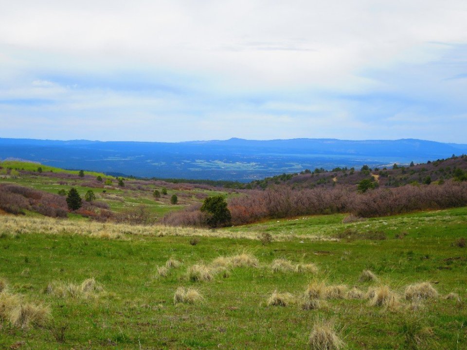 After lunch we walked through the most beautiful green meadow with the snow cover all but gone. Gentle rolling hills, groves of aspen with spring leaf growth and distant views of a town below, I think may have been Canjilon. It was a beautiful springtime scene, all that was missing was a little spring warmth and sunshine. A cold wind rose up from the valley below. As we were hiking on dirt roads the snow melt created quite boggy soil. It stuck to our shoes and was really slippery in places. It was impossible to keep our feet dry.
