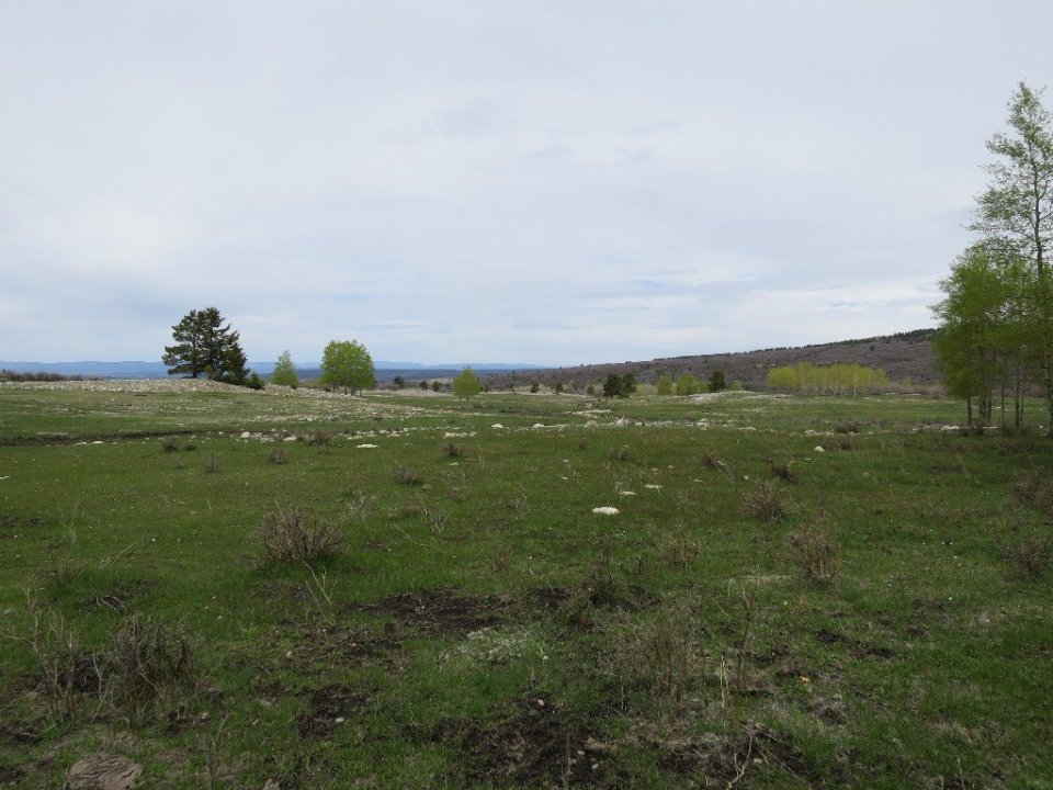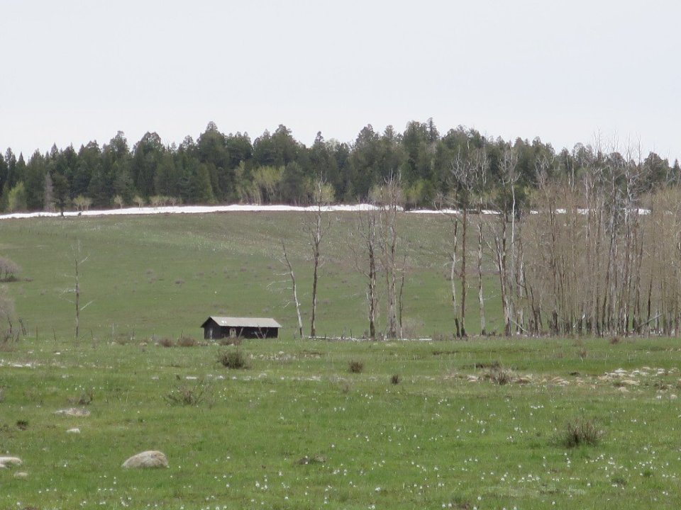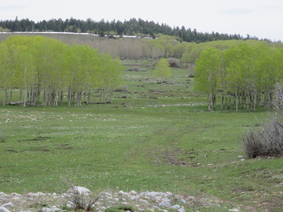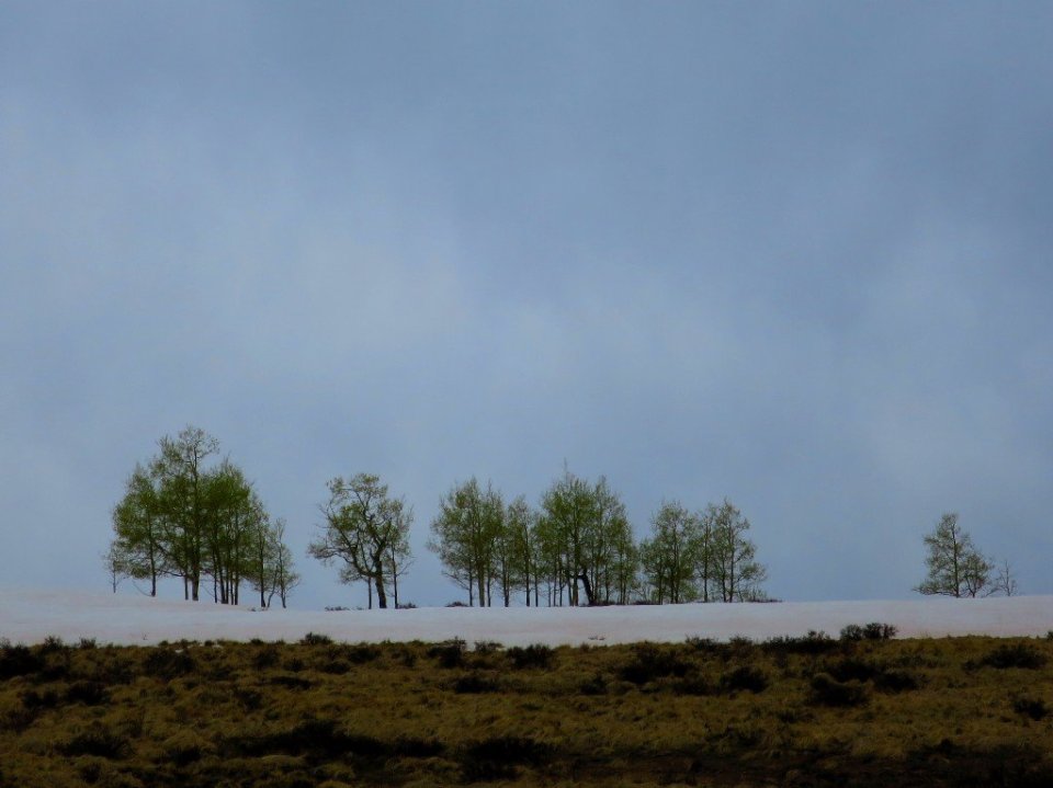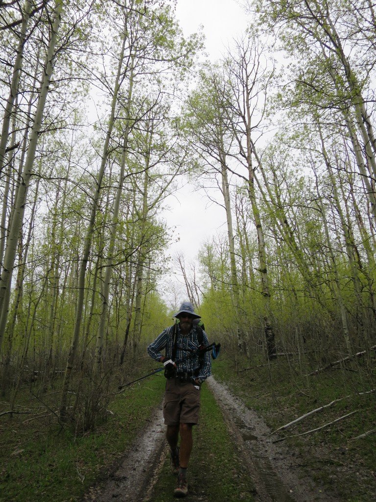 We followed the jeep road through groves of aspens with their spring coat on. The gentle green of the new leaf growth looked beautiful even against the grey sky.