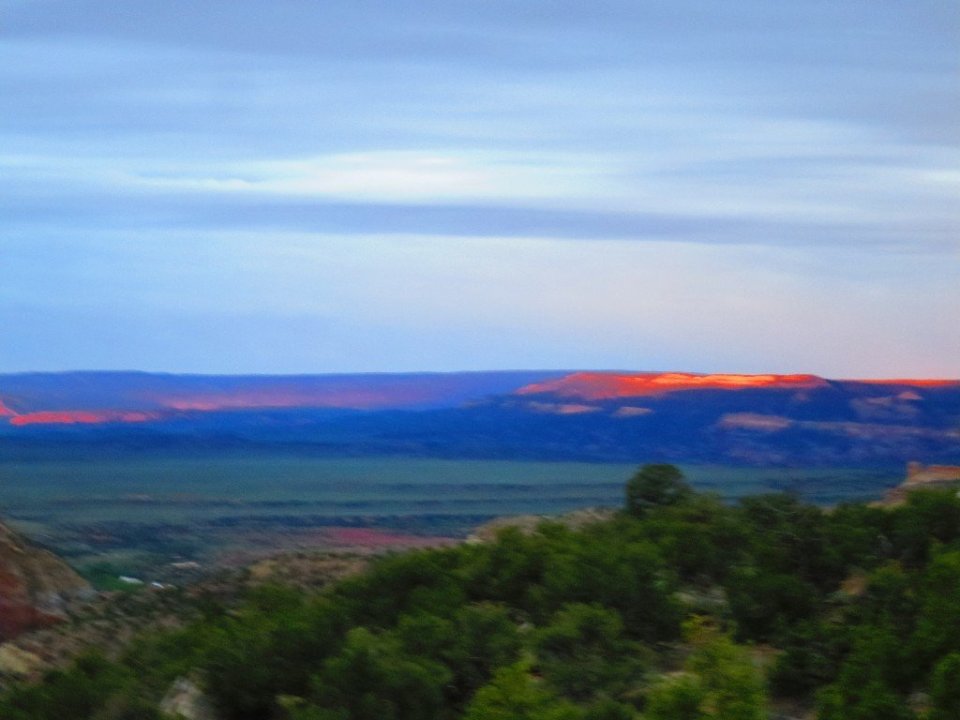 The sun was hitting the tops of the canyon walls down in the valley we passed through yesterday. They were glowing red, they looked like they were on fire. This was the closest we came to seeing the sun all day today.