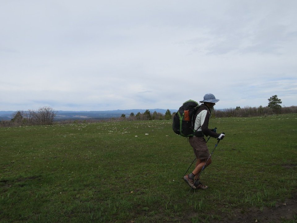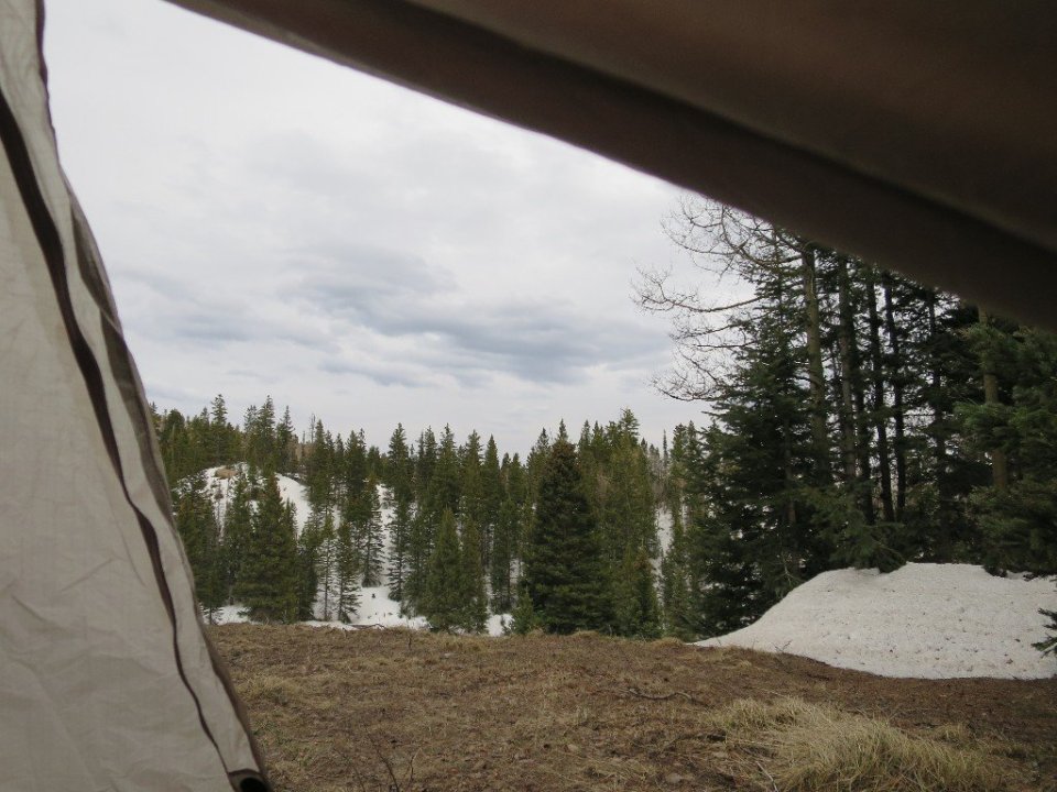 With increasing snow cover we were running out of campsite options. It was almost 7pm before we passed a snow free hillside off the trail. We climbed to the top and found a perfect flat spot that was snow free and out of the wind. I was ever so relieved. As I finishing writing this post I’m snug and warm in my sleeping bag while the wind howls up in the pine tree tops above us.