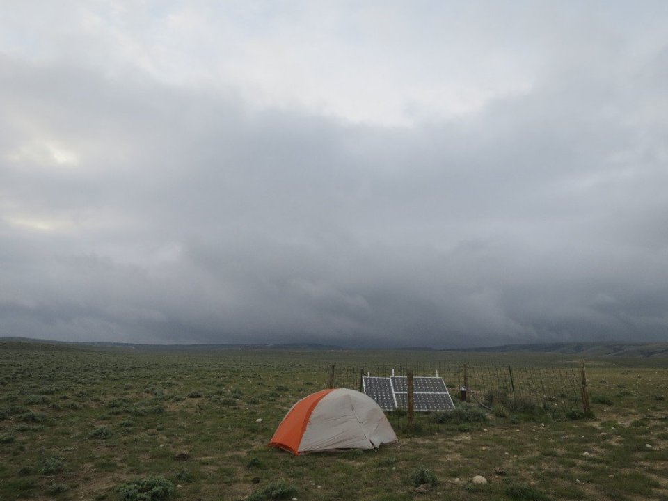 About a mile further in we passed a grassy area cleared of sage brush. That was going to provide at least flat ground to set up a tent. In one corner of this cleared area was a fenced solar panel. That would have to do to provide little shelter from the wind.
