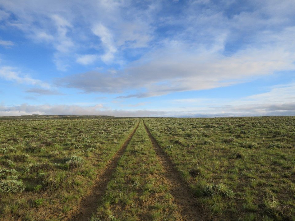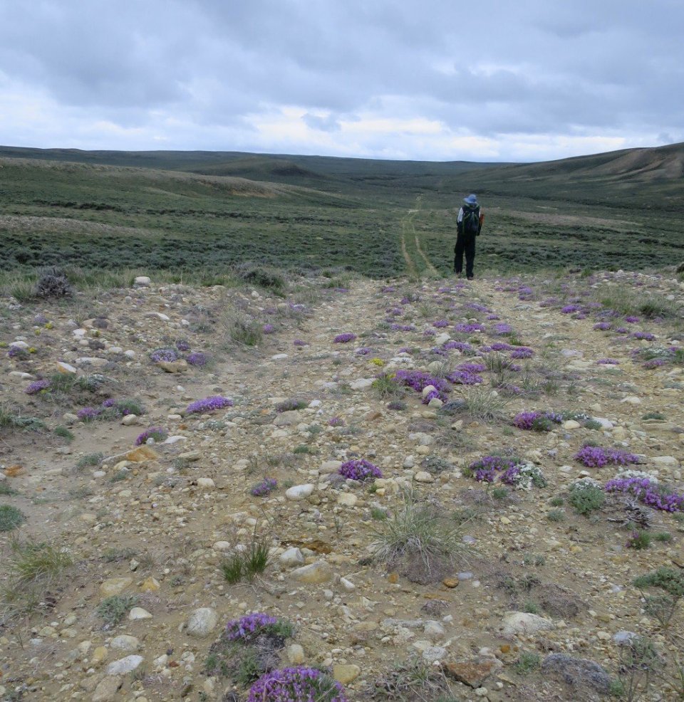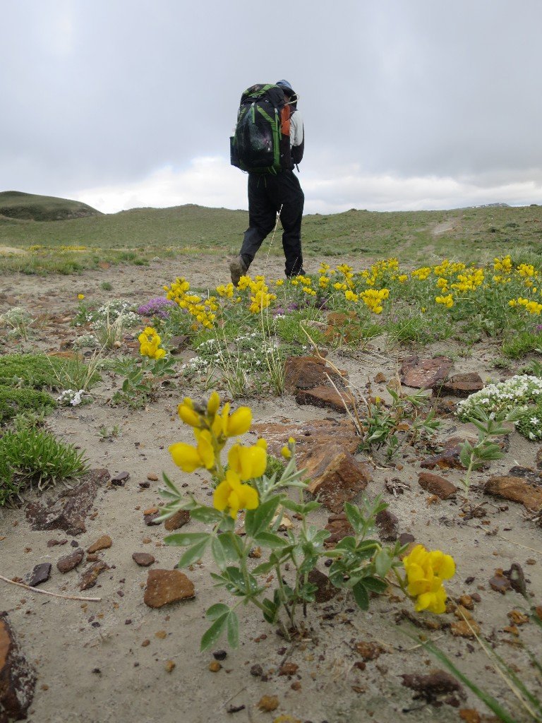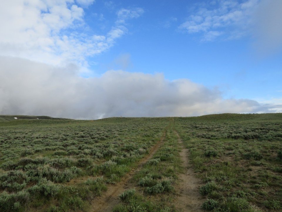 We broke camp and were on our way by 6.30am. The trail followed a jeep track created in the sage brush which defined the flat landscape almost to the horizon. It was pleasant hiking conditions as we set out. Low grey cloud hung close to the ridges in the distance ahead of us. We were delighted that the morning did not meet the weather predictions. There were huge patches of blue sky and some sunshine. But this did not last.
