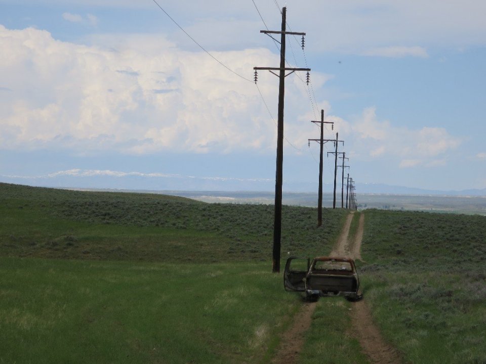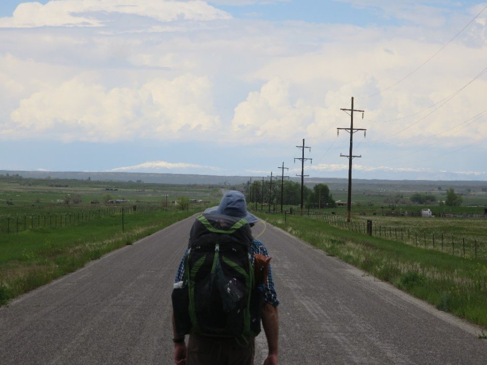 It was a lovely couple of hours hiking on dirt roads with views over lush green fields back towards Lander and the snowy peaks on the Range. The dirt road eventually ended and we were on asphalt Mill Creek Rd and then the Blue Sky Highway (Route 132). Although a highway is a bit of a misnomer, it was a single lane in each direction road that was not all that busy.