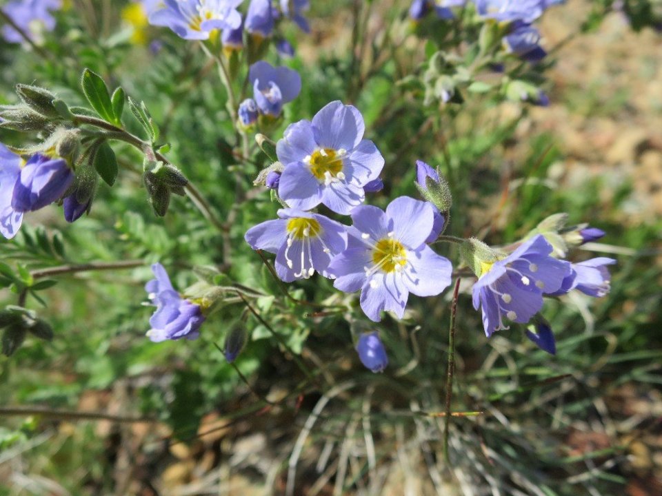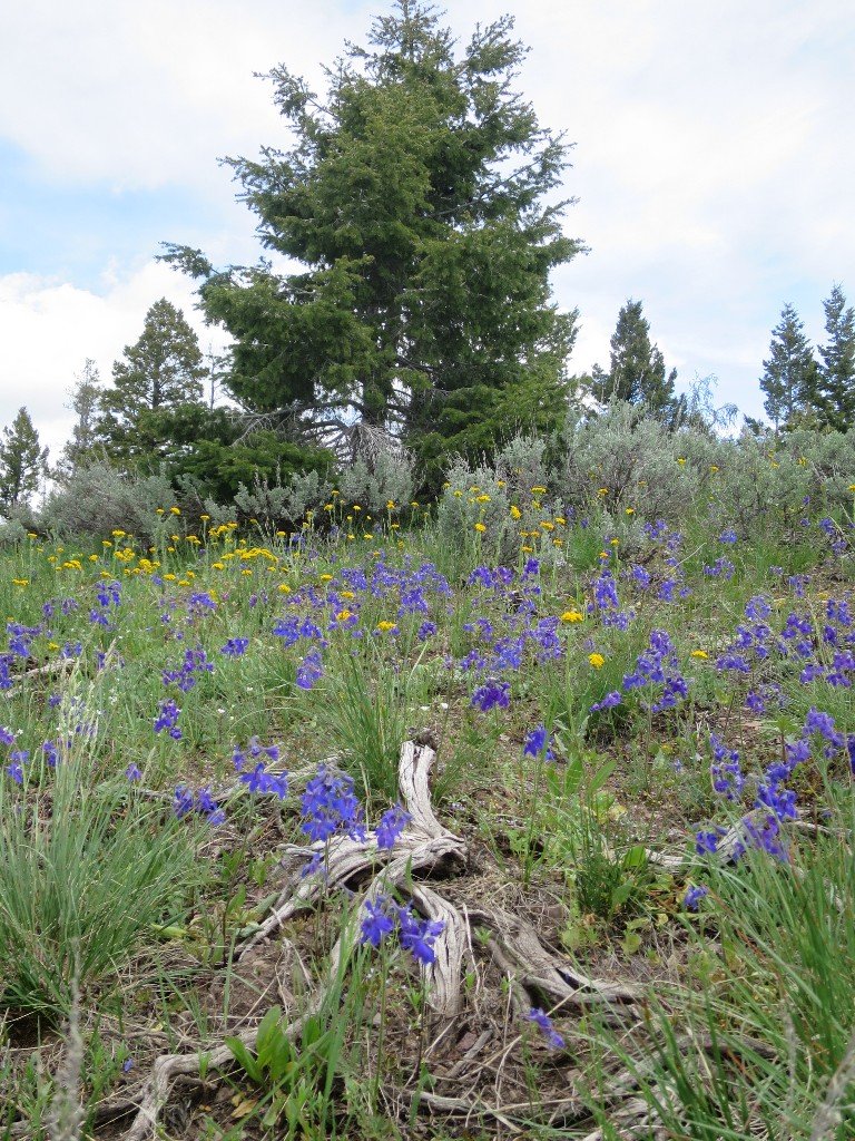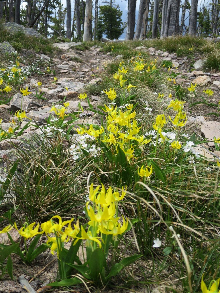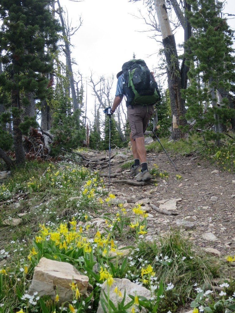 Shingle covered ridgetop with masses of flowers carpeting the ground. Deep green forested valleys dropped away on both sides. It was such an unexpected surprise. It was a tough steep climb in sections but the scenery made it all worthwhile. It reminded us a little of the Goat Rocks Wilderness in Washington but without the huge mountains anchoring the ridgetop. It was so spectacular we did not want it to end. But a cold wind blowing from the east encouraged us to hurry off the mountain and get to a campsite.