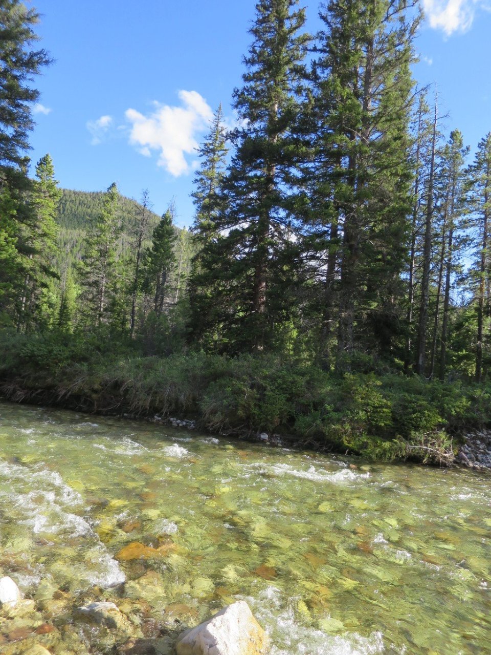 By late afternoon we descended through a green pine forest for a couple of miles to Dearborne River. We were exhausted by the big climbs, the wind, the snow and the river crossings which seem to go on forever. We could not stop for the day until we crossed the river one more time so that we wouldn’t have to do it first thing tomorrow. That was our final chilly challenge of the day before setting up camp. It’s been a tough day, with fantastic scenery.