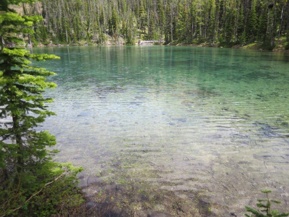 Our attention most of the early part of the day was taken by lots of grizzly prints on trail. One set was going in the opposite direction the others were going in our direction. There were also shoe prints of another hiker in front of us. These tracks in the snow were being followed by what looked like a mountain lion print. Despite the evidence of recent grizzlies activity we did stop for lunch by a beautiful ephemeral lake. It was shallow and a most beautiful emerald green colour. And it was also protected from the wind.