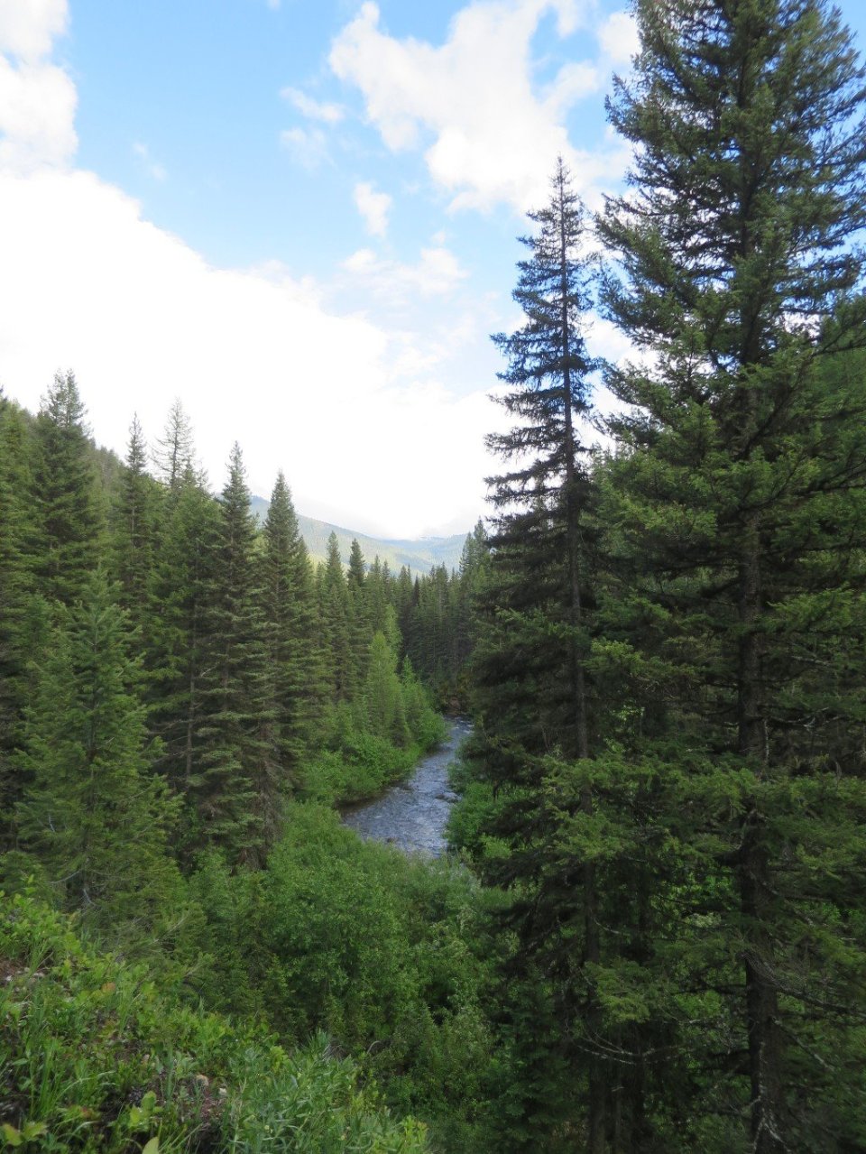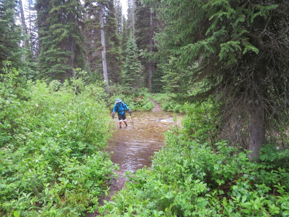 The first half of the Spotted Bear Trail passes through a river valley with lush green healthy forest and numerous crossings of Spotted Bear Creek and its tributaries. As we descended into the valley, it felt warmer and before we reached a campsite even a ray of sunshine appeared. Incredible how a little bit of sunshine on a grey, gloomy day lifts your spirits.