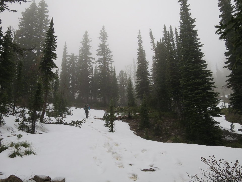 Patches of snow covered the trail as we rose towards the top of the pass. The snow was firm enough that postholing was not a problem and enough of the trail was uncovered so that navigation was not a problem. It was cold and a heavy fog hung low on the pass.