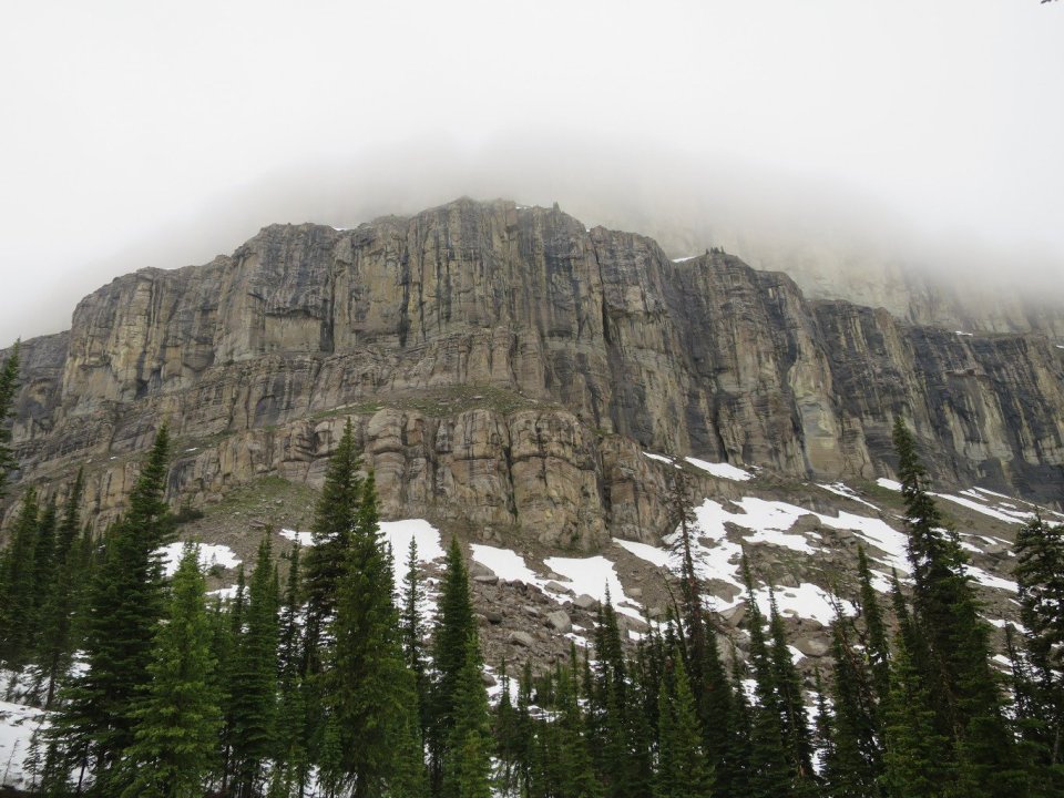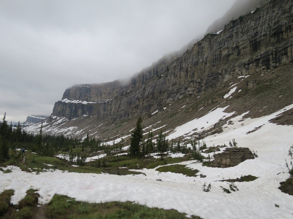 Once we reached the pass and dropped over the other side the start of the Chinese Wall started to reveal itself. It is a high vertical rock escarpment the tops of which today were shrouded in fog. We followed the base of the wall and fog threatened to lift to reveal the top, but did not quite manage to lift.
