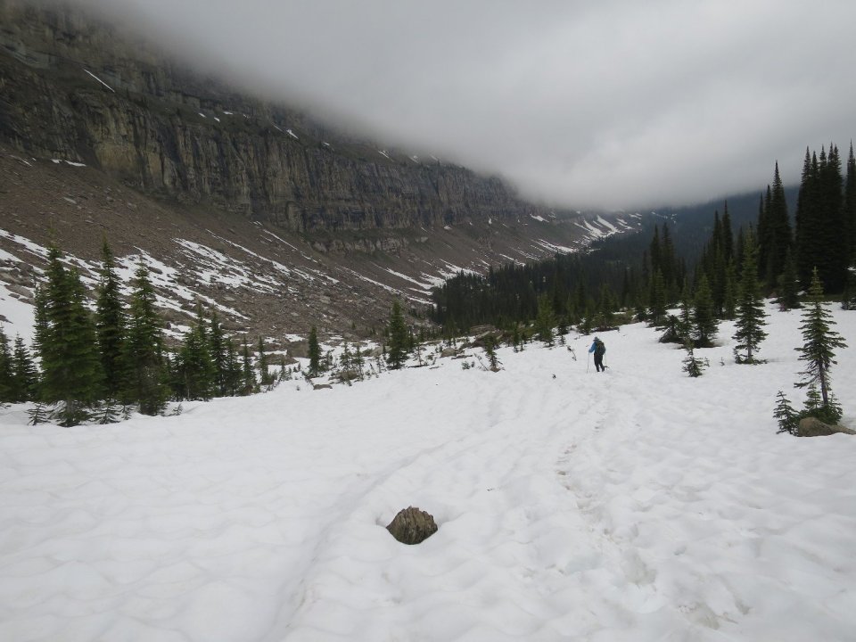 The trail went along the base of the wall and was in an out of snow cover or was either boggy or under water. We gave up any chance of keeping dry feet. As long as we were moving it was OK. The awesome landscape distracted our attention from the cold, wet feet. Just before lunch we turned away from the wall and headed west. Here we encountered continuous snow cover for the descent to a lake, where we were going to stop for lunch. The heaviest snow cover we’ve hiked on since leaving Butte.