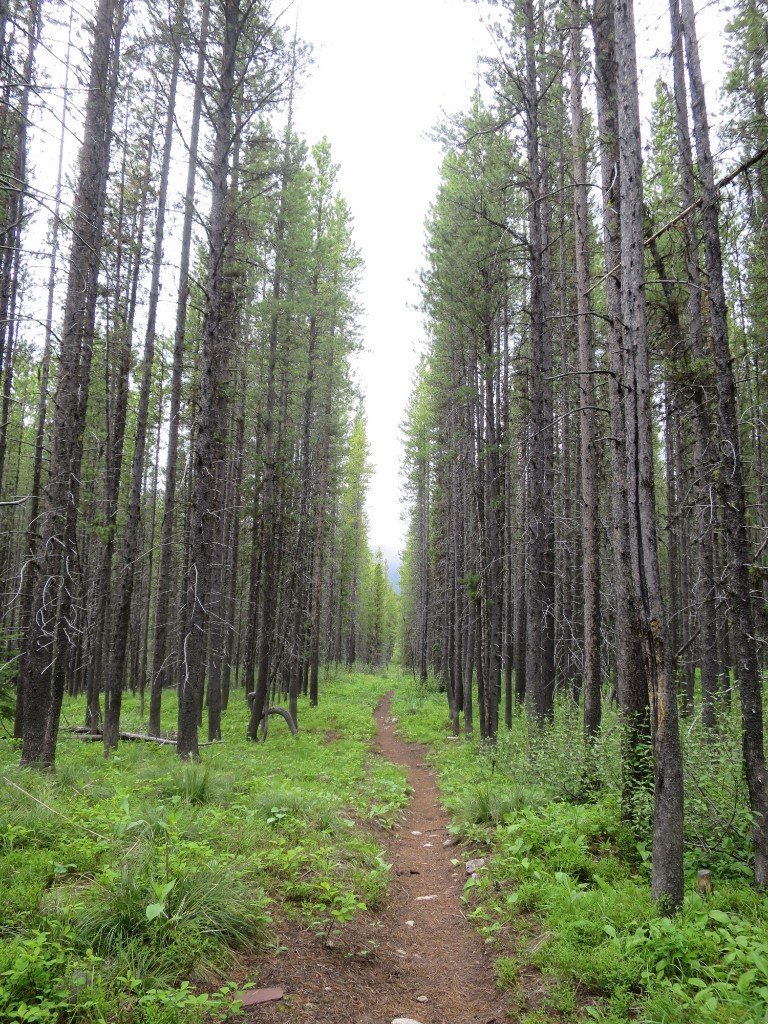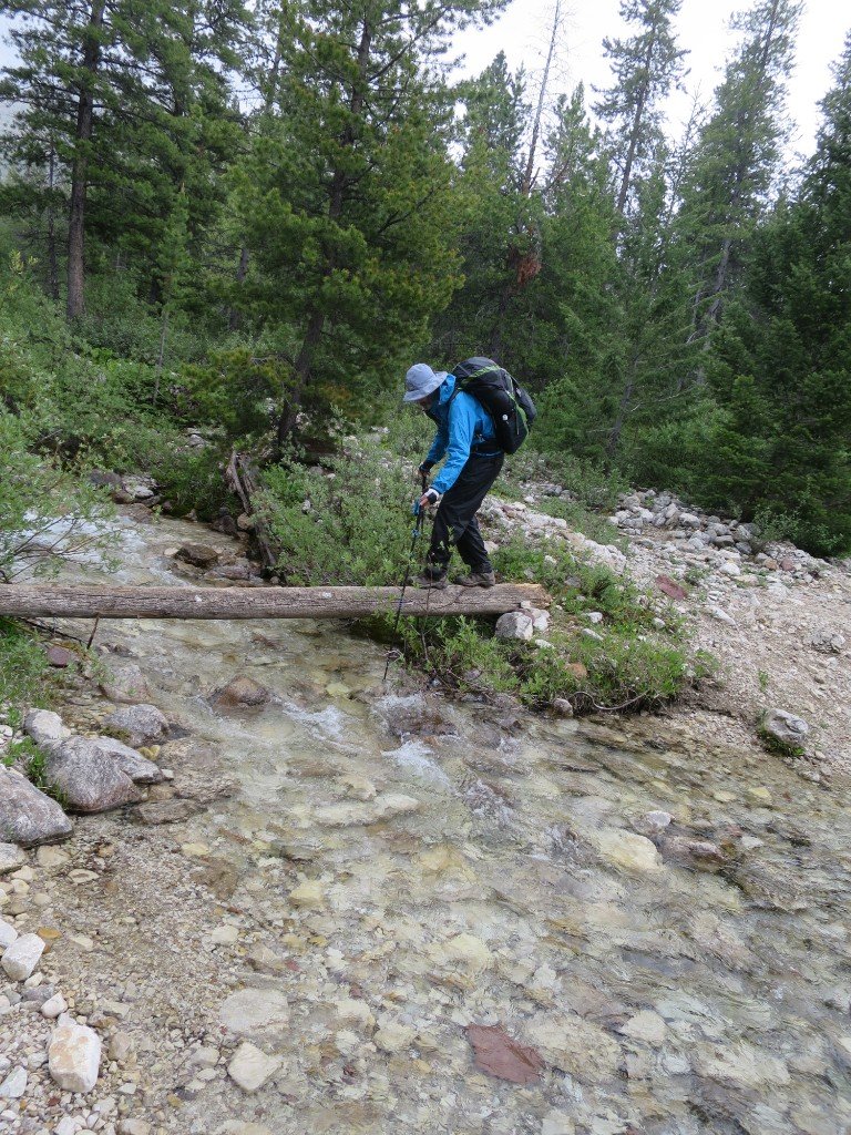 The green forest soon gave way to burnt forest areas and the wind funneled through. I was cold and was already dreading the next Sun River crossing. This second crossing was not so deep. My feet were already cold so getting into icy cold water did not seem too much of a shock.