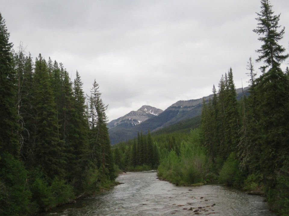 We stopped for lunch by another bridge over the Sun River. The sky was still grey but we hoped that the sliver of blue would open up. And for a brief period it did. This brief period of springtime sunshine did not last. The clouds closed in and it started to rain again. While the sun was out briefly we got a glimpse of how beautiful the surrounding landscape can be on a nice day.