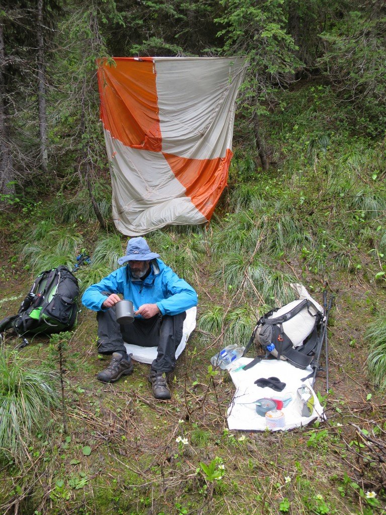 The patch of blue sky lasted long enough for us to finish lunch and dry the tent fly. The clouds rolled back in and the rain returned.