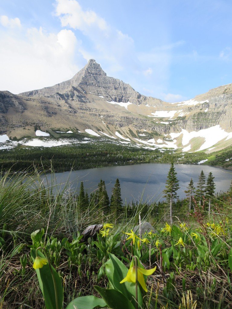 It was with a spring in our step that we left the campsite this morning. Sunrise was illuminating the cliff above Pray Lake which was near our campsite. It was going to be a bright, bright sunshiny day. Despite last nights rain, the trail side vegetation did not seem to hold much moisture and we managed to keep our feet dry for quite some time. The trail was well made and maintained, no mud bath here. What a joy. Very quickly we ascended out of the Two Medicines Valley and started on the gradual climb over Dawson Pas to Pitamakan Lake, rising 2,400 feet.