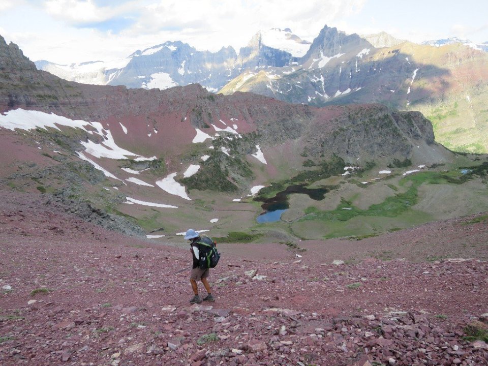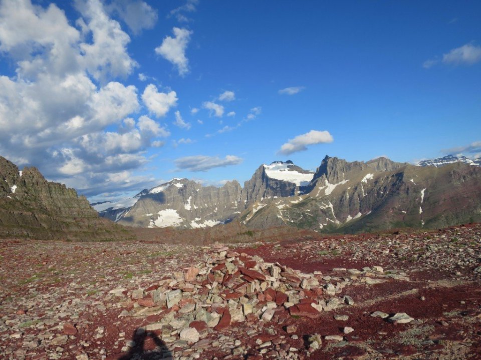 We had one more pass to go over before the the border. Red Gap Pass was 6 miles away from Poia Lake rising over a 1,000 feet. The trail rose gradually until we were above the treeline. The steepest part of the rise was a series of switchbacks on loose screens which thankfully was free of snow. I was happy to have another day in this magnificent mountainous landscape. Red Gap mountain to our left is entirely made of red rock material that we first saw in Waterton National Park.