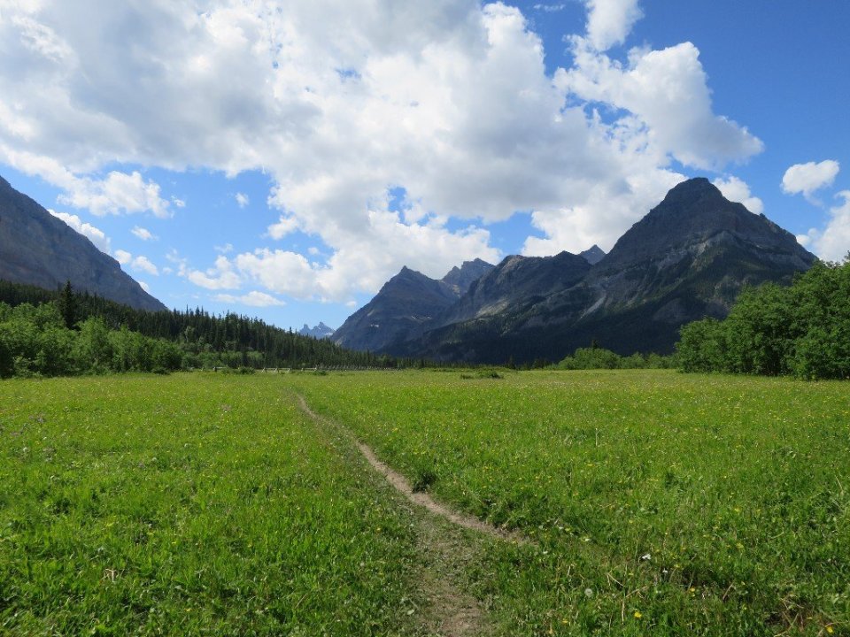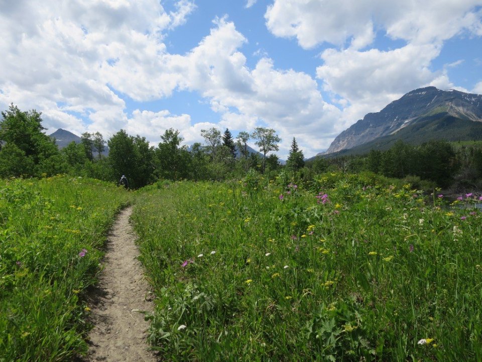 Not long after leaving the lake the mosquito activity ceased. From the lake we had an 8 mile long hike along Belly River to the border. When out of the forest, it was a lovely hike through flower packed meadows. The last 3 to 4 miles felt never ending.