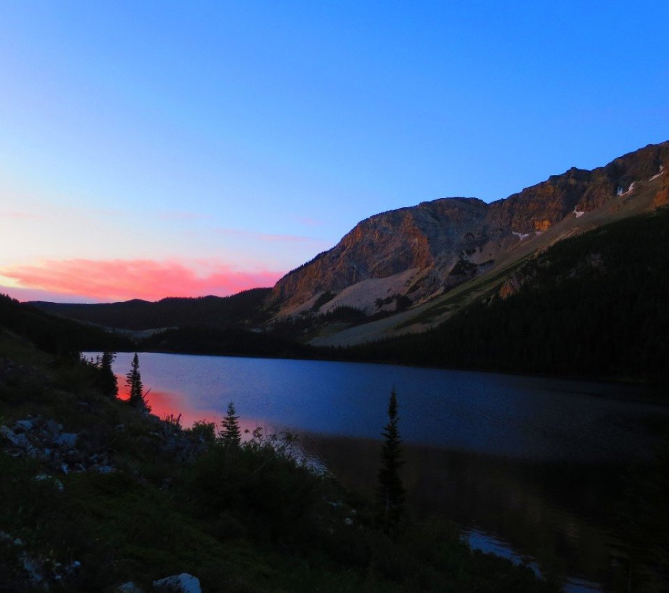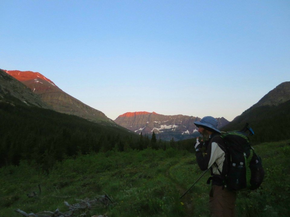We left early eager to get to the border and have plenty of time to hitch back to East Glacier Park. Poia Lake looked beautiful as the pink and red of the sunrise lit up the sky and the tops of Red Mountain.