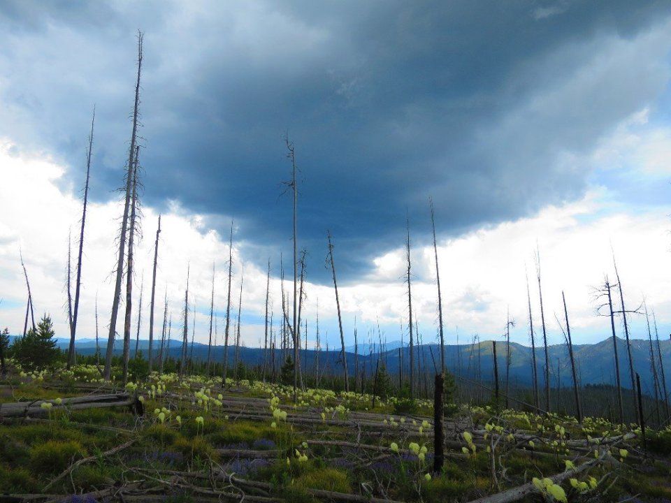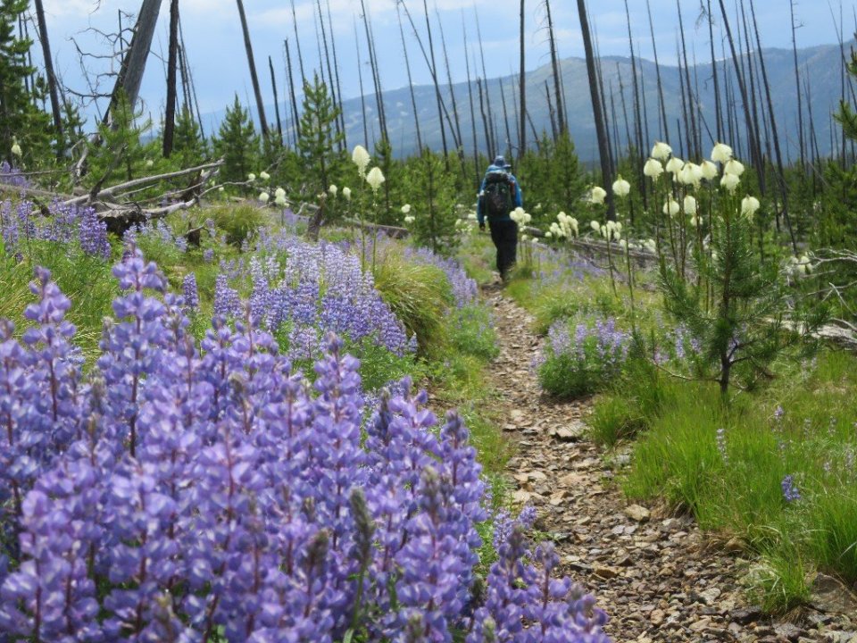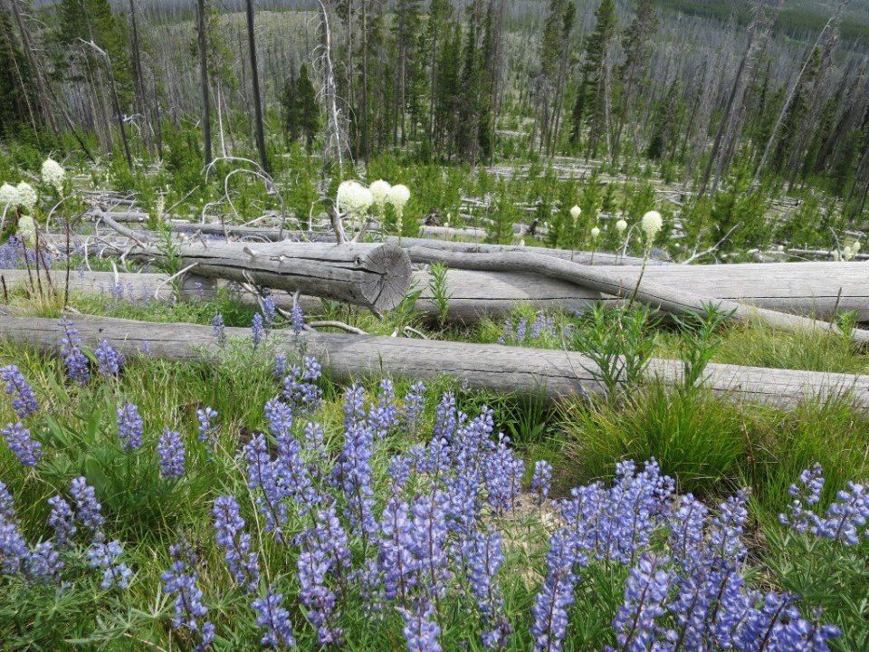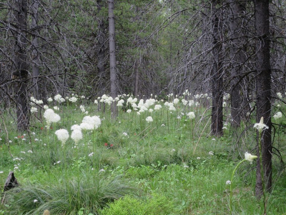 After we descended this ridge, we spent the rest of the day going up and down rolling hills covered in burnt forest at various stages of recovery. Lupins and bear grass, in intensily thick stands, added colour and interest to an otherwise bleak landscape. Occasional patches of unburnt forest were like a breath of fresh air.