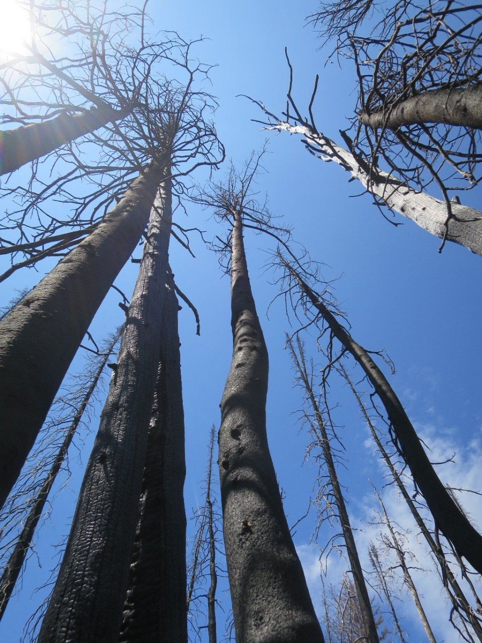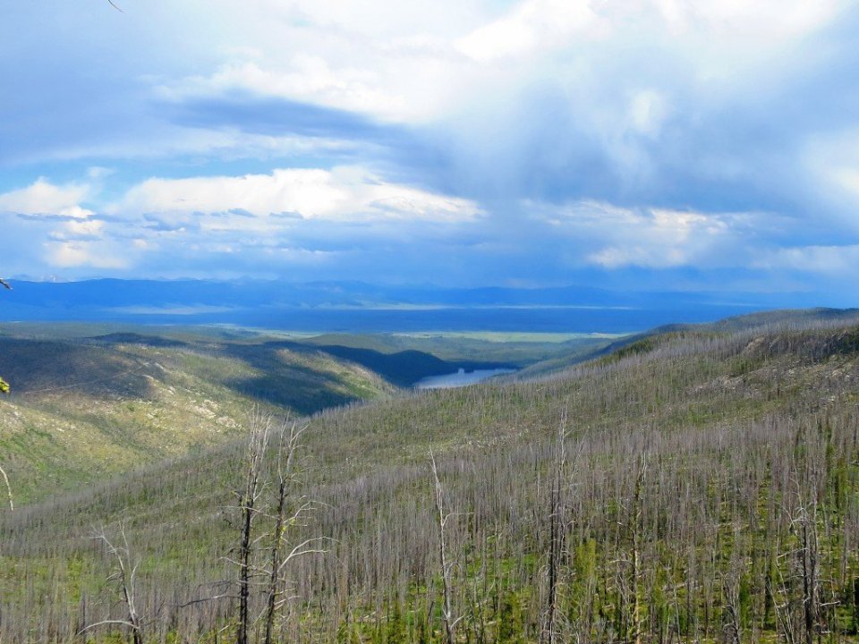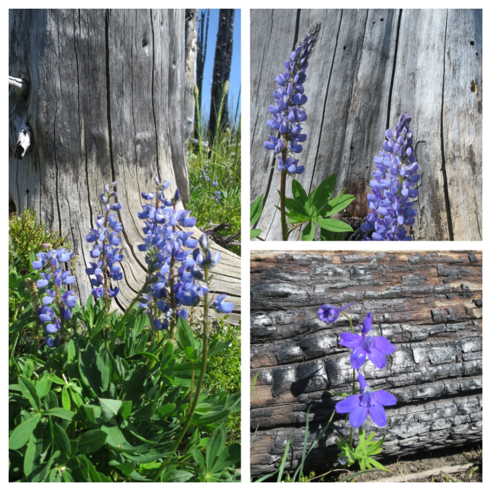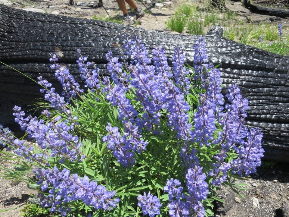 By lunchtime we were leaving the high mountain peaks and entering a softer rolling hill landscape. And the dense, green pine forest did not last sadly. We soon entered a big area of burnt forest. A section of it looked like a fire had gone through recently. The trees were burnt so thoroughly even the roots on some were burnt. Wildflowers were abundant in some sections and provided beautiful contrasts against the blackened stumps.