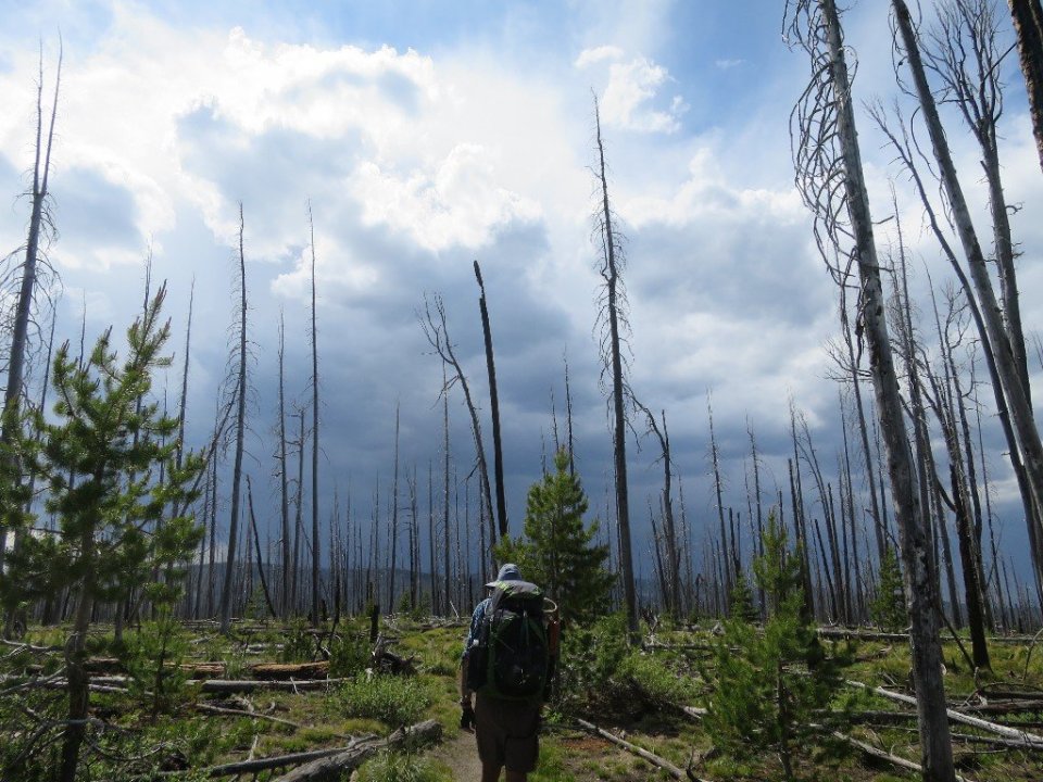 The healthy forest gave way to more burnt area and we spent most of the late afternoon hiking through burnt areas while trying to outrun a storm that was building. A section in a deep gully had the worst blowdowns we’ve experienced on trail so far. Hammer got a few scrapes and cuts to his arm and leg trying to get over burnt logs.