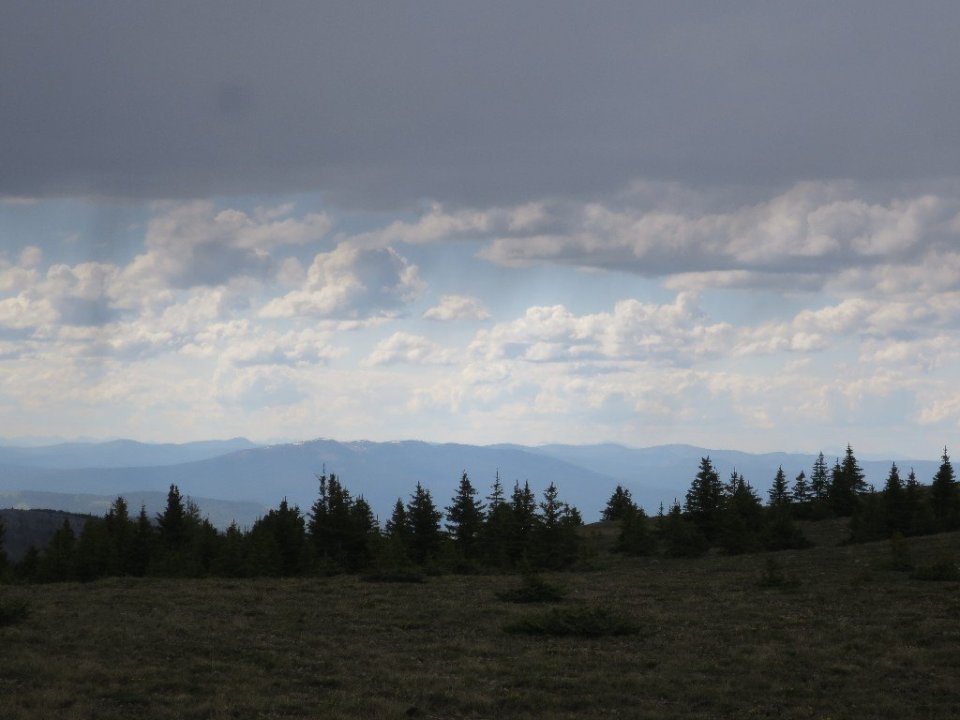 By the time we reached Goat Flat, where we rejoined the CDT, the sky had darkened and rolling thunder could be heard in the distance. It was already raining and as we started to descend off the pass the rain increased and we were back in full wet weather gear.