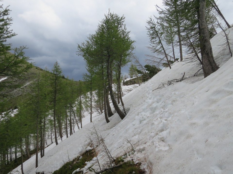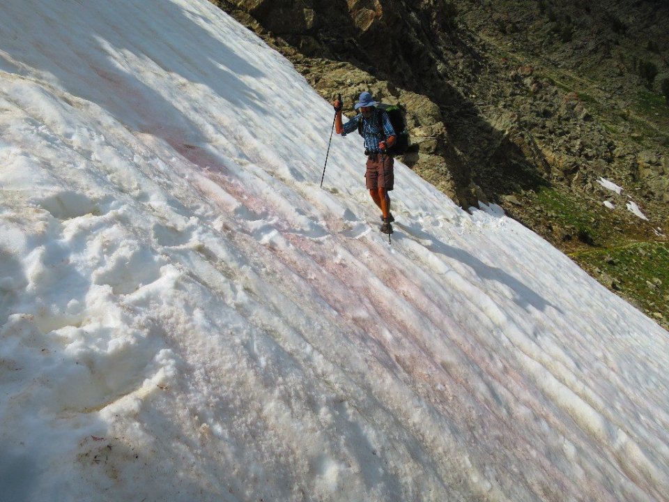 And sure enough we did have to cross the snow shute. It was steep and tricky but the snow offered reasonably good grip. We made it across without too many problems