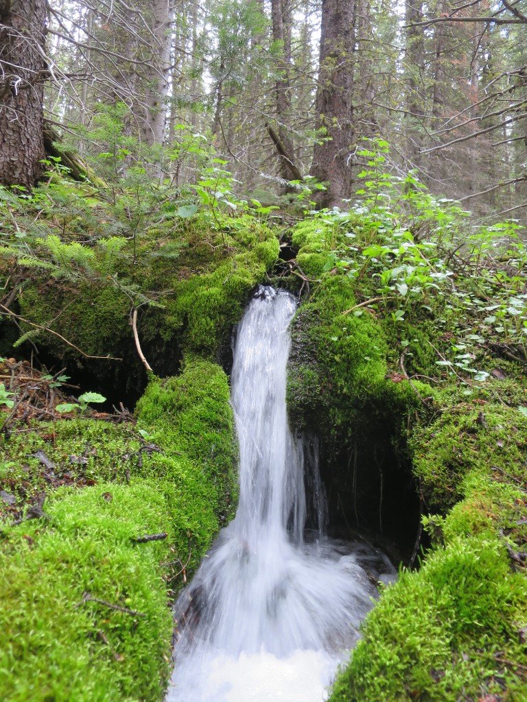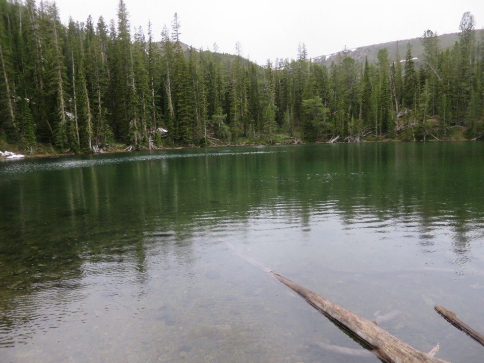 The trail on descent held quite a bit of snow but enough of the trail was exposed that navigation was not a problem. In the distance we could see blue sky ahead. It just wasn’t close enough to us. We stopped for the day by Page Lake. It was raining as we put the tent up. By the time we were settled the rain stopped and the sun came out. So changeable, so quickly.