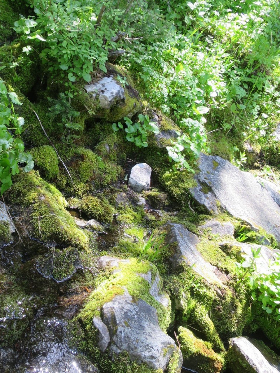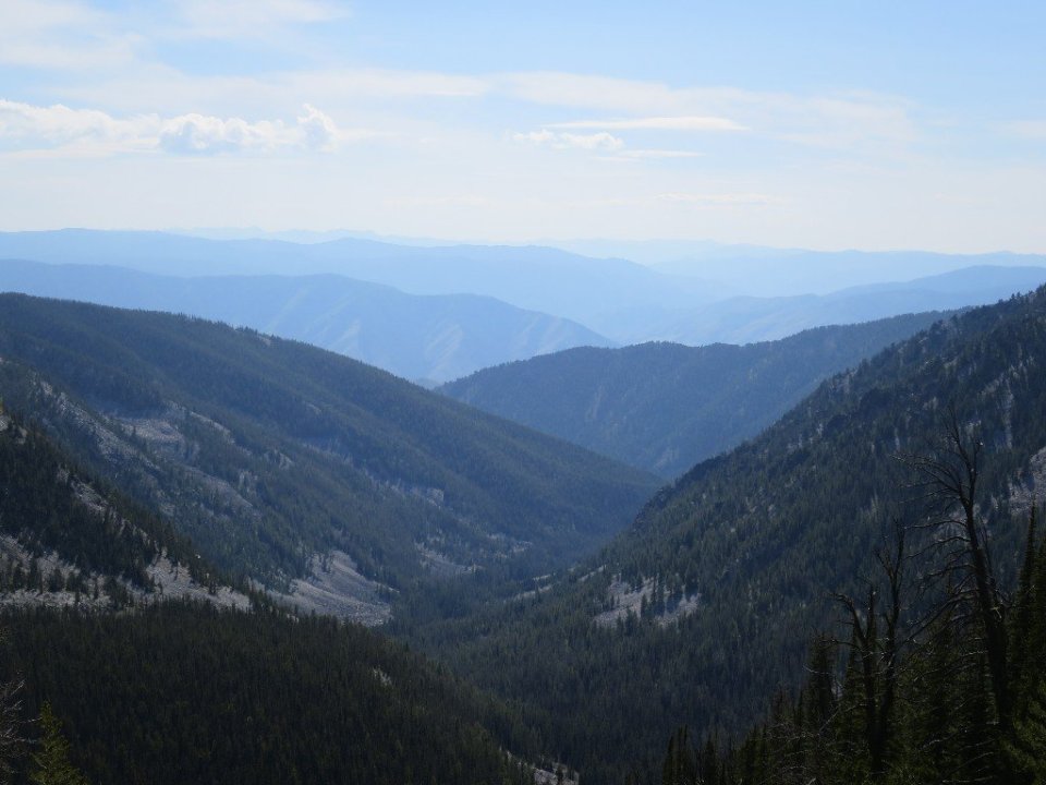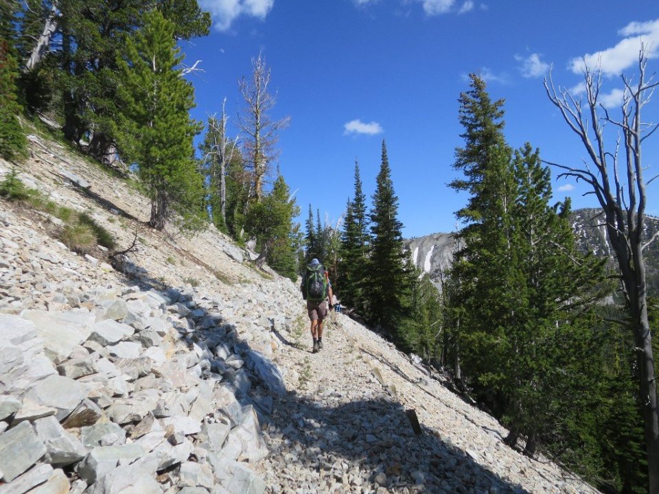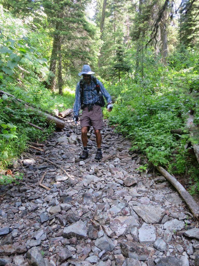 From here the afternoon hiking was diabolical. The trail was almost vertical and it was neverending, with three more crossings of the South Fork Sheep Creek. On the first crossing Hammer tried to go across a log. It was slippery and he fell breaking one of his hiking poles. Luckily no other injury. We could see that somewhere above us it was a beautiful sunny day. But we were deep in a narrow gully and not a lot of light penetrated, moss covered rocks and lush green growth predominated.