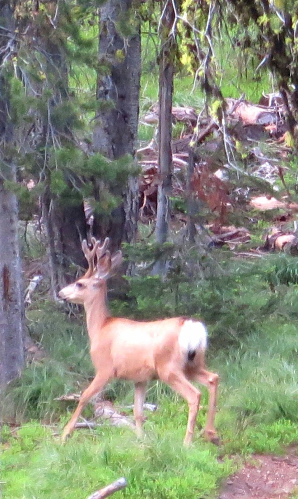 Paye stopped to have lunch and we kept hiking. The trail diverted off the logging road and we hiked on single file trail which went up and over several ridgetops. We had terrific views of distant peaky mountains. I wondered if the trail would lead us towards them.