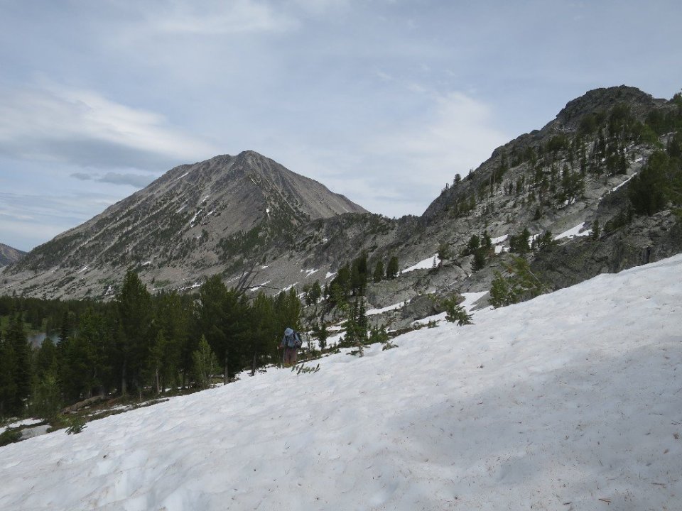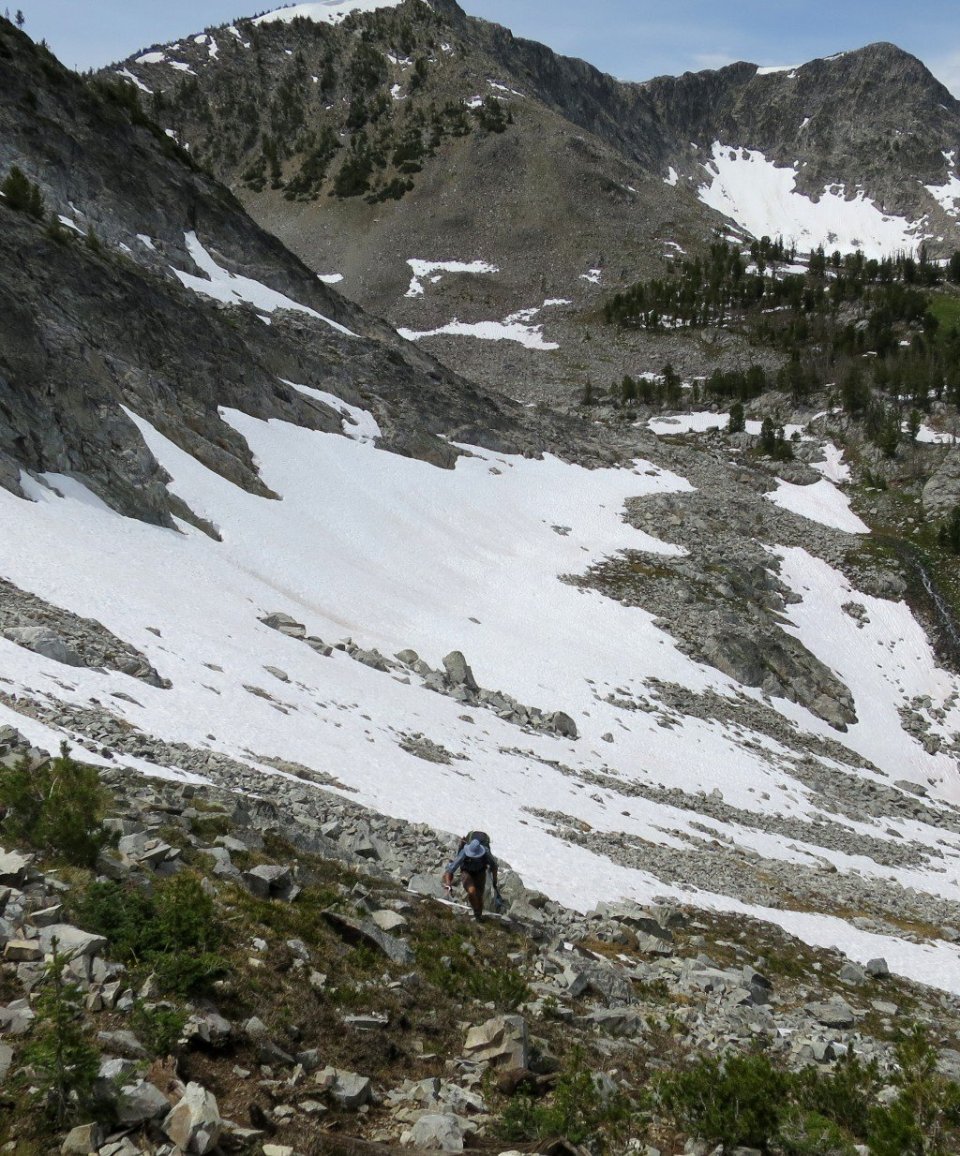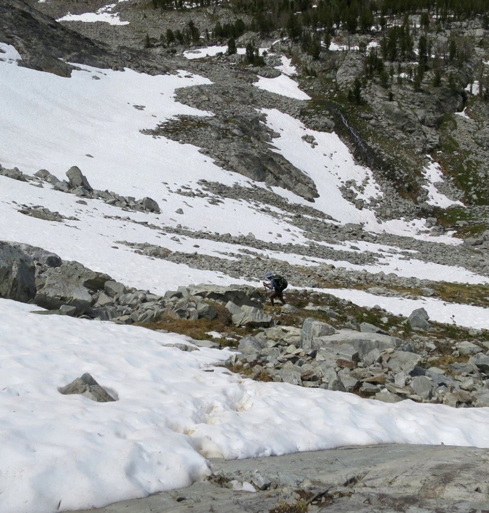 From the pass we descended for 5 miles following a creek. It was steep and snow covered at first and then leveled off past the Rock Island Lakes for a long descent. There was only the sound of running water and our footsteps for a few hours.
