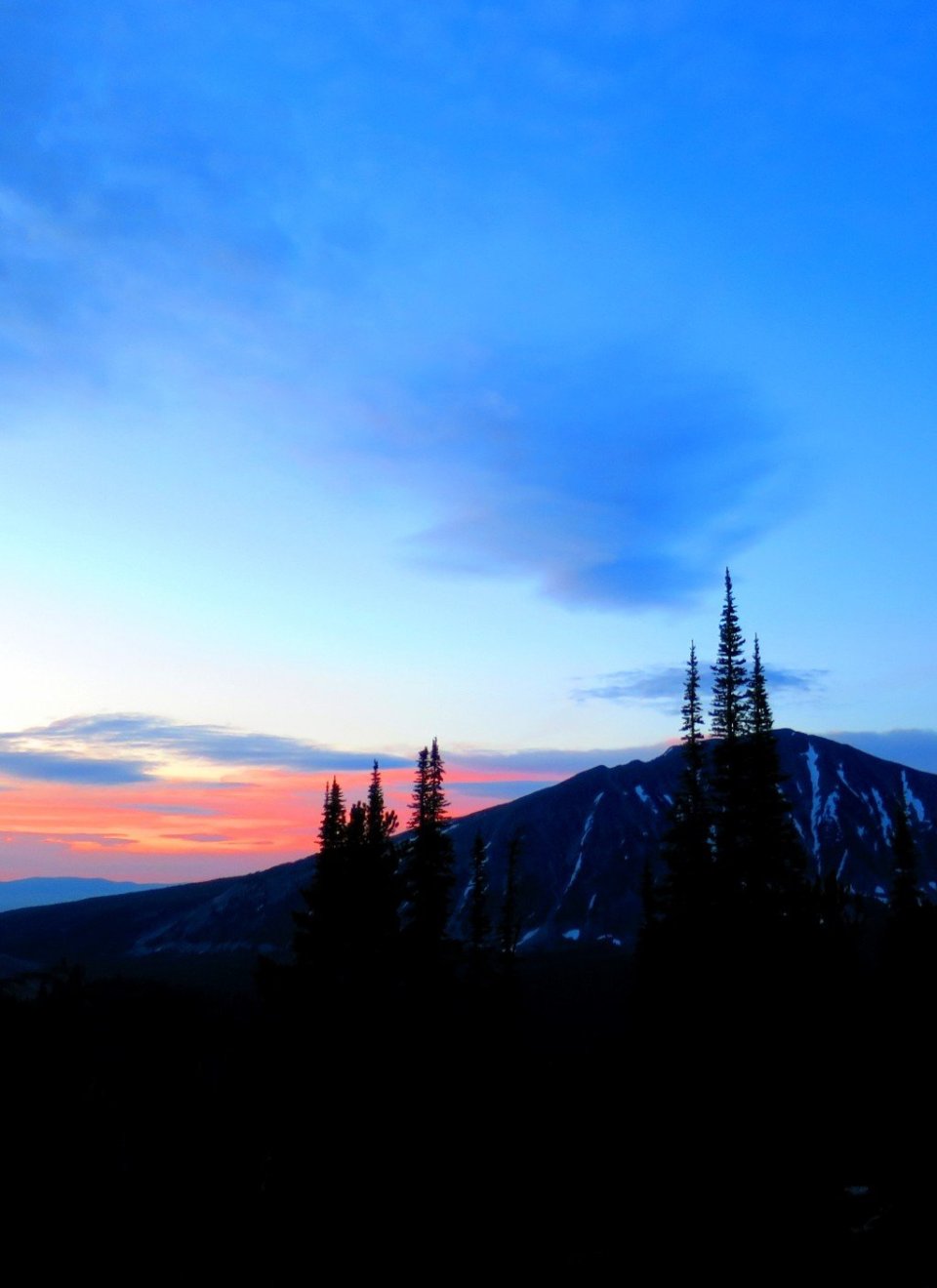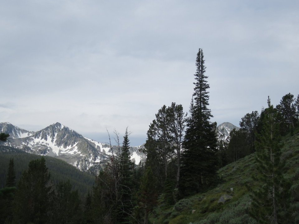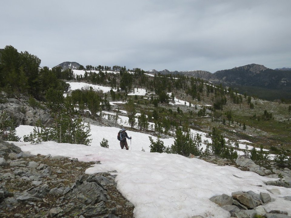 A long descent through a forest and snow melt stream was followed by a hard climb to the first mountain pass, at 9,000 feet. We stopped on top to have breakfast accompanied by hordes of mosquitoes. We even got phone service briefly from the top of the pass.
