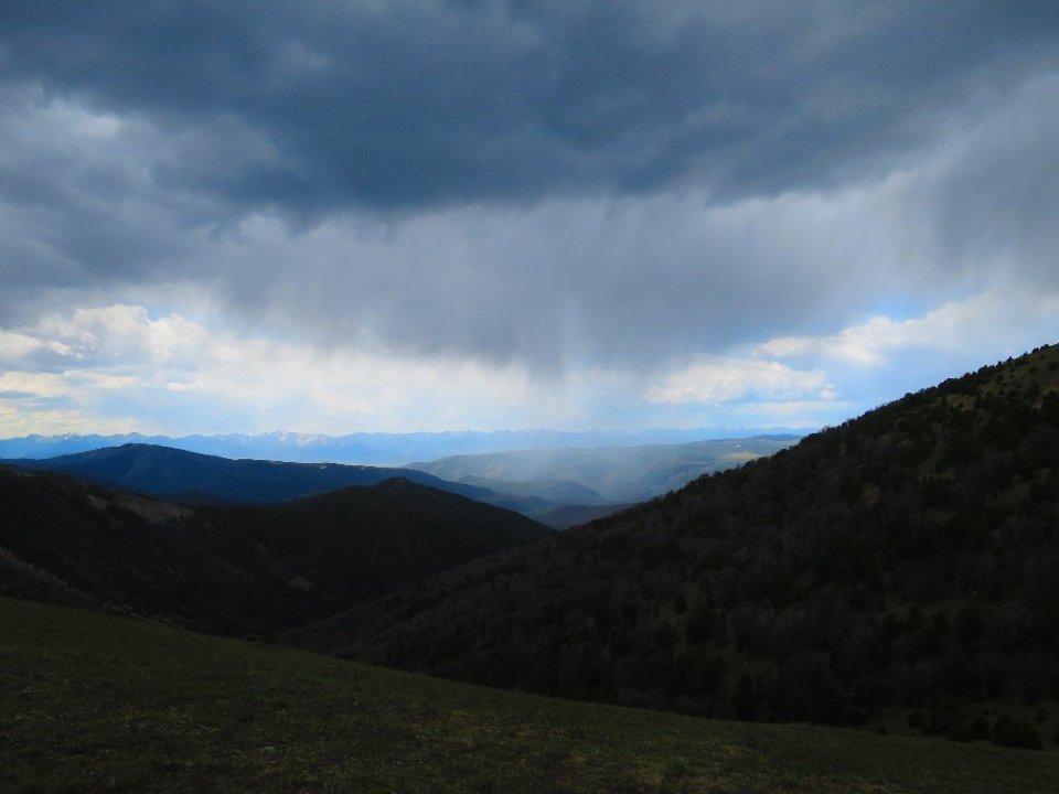 We stayed high and on a ridgetop as the dark clouds danced around us.There was little shelter as the ridges were not vegetated. We stopped for the day at the first group of trees with flattish ground slightly off the trail. The wind was very cold and we wanted a little bit of shelter. And just as we got inside the tent, the rain started again.